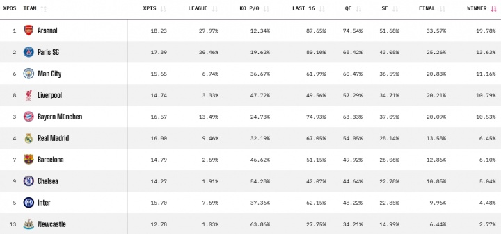 opta欧冠夺冠概率↓