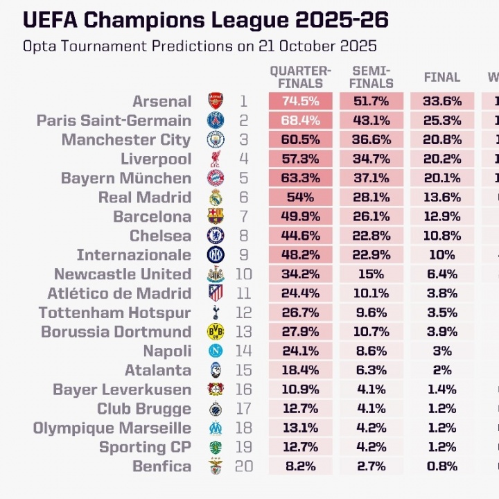 直播吧10月21日讯欧冠联赛阶段第三轮开赛在即,opta超级计算机更新了欧冠夺冠概率,其中阿森纳位列榜首,巴黎、曼城分列二三。