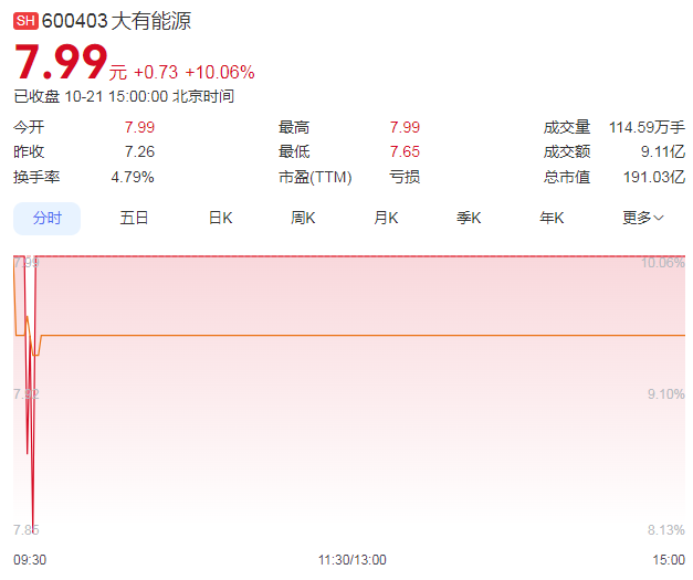 10月21日,大有能源股价再度强势涨停,股价报7.99元/股。当日换手率为4.79%,成交额达9.11亿元,总市值攀升至191.03亿元。据统计,自10月10日以来,该股累计涨幅已经超过103%,股价表现极为亮眼。