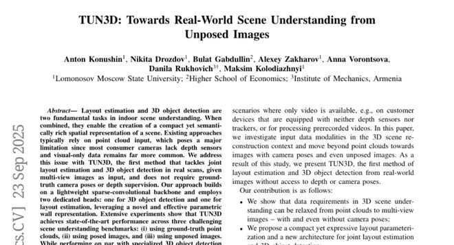 这项突破性研究由莫斯科国立罗蒙诺索夫大学、俄罗斯高等经济学院以及亚美尼亚力学研究所的联合团队完成,第一作者是安东·科努申(AntonKonushin),通讯作者是达尼拉·鲁霍维奇(DanilaRukhovich)。这项名为"TUN3D:TowardsReal-WorldSceneUnderstandingfromUnposedImages"的研究发表于2025年9月的arXiv预印本平台,论文编号为arXiv:2509.21388v1。有兴趣深入了解的读者可以通过该编号查询完整论文。
