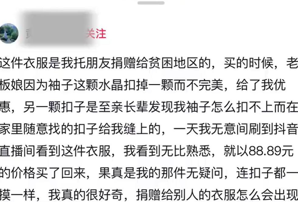 近日,四川省的黄女士在刷直播时,突然发现一个主打卖“孤品”的主播穿着的白色蕾丝衬衫有点眼熟,袖子上那颗“与众不同”的扣子太可疑了。 当初买这件衣服的时候,因为衣服袖子上的水晶扣掉了一个,老板特意打了折自己才买回家的。后来,家里老人看到,随便找了一颗扣子钉了上去。前段时间这件衣服和其他的旧衣服一起打包,拜托朋友捐给贫困山区了。 为了验证自己的猜想,黄女士特意花88.98元拍下了衣服,收到后,一看上面的缝补痕迹就确定了。她十分纳闷,怎么捐赠出去的衣服会出现在直播间? 黄女士把事情发到网上,有网友说自己也在直播间花了399元买回了10年前捐掉的羊绒大衣,上面还有自己亲手缝的痕迹。还有人说在直播间买的衣服,口袋里还放着别人留下的纸条和发绳。 公益回收箱、旧衣回收箱几乎遍布各个小区,很多人都觉得自己限制的衣服有了新出路,可以转给有需要的人。但是这些衣服只是经过专人挑选,有品牌的、成色好的经过简单处理,就成了直播间里的尾货孤品;残次品会打包卖到非洲等贫困地区。之前就有很多人在短视频刷到,自己的旧校服竟然漂洋过海出现在非洲老铁身上。 所以,直播间一旦挂出“尾货”“孤品”,要想好再下单。别钱花了,买回来的是别人不要的旧衣服,来源不明又没有消毒,想想都膈应。