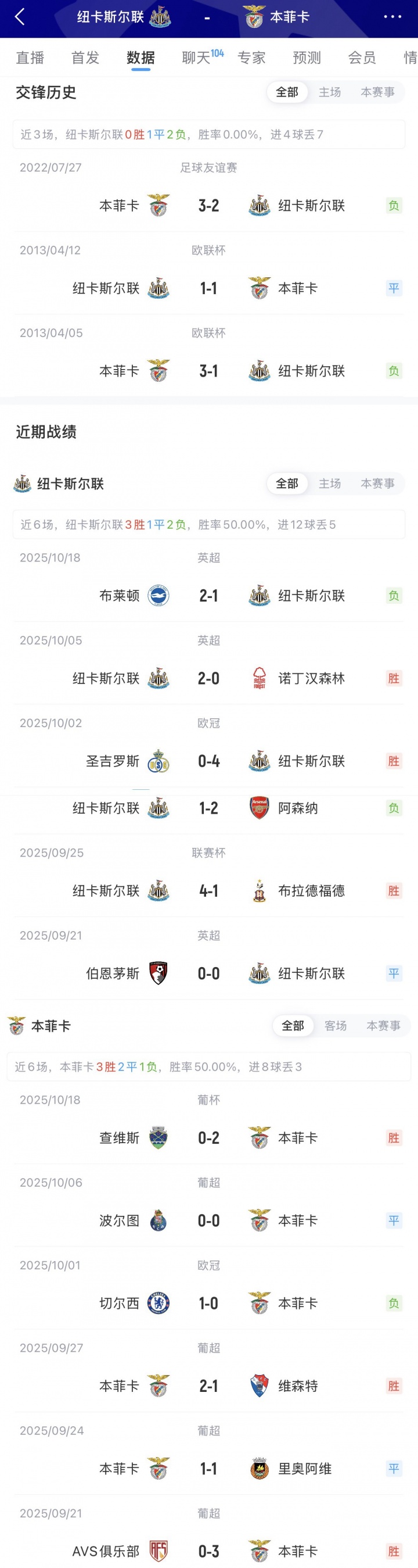 纽卡斯尔欧冠开赛2轮1胜1负(1-2巴萨、4-0圣吉罗斯)、本菲卡遭遇2连败(2-3卡拉巴赫、0-1切尔西)!