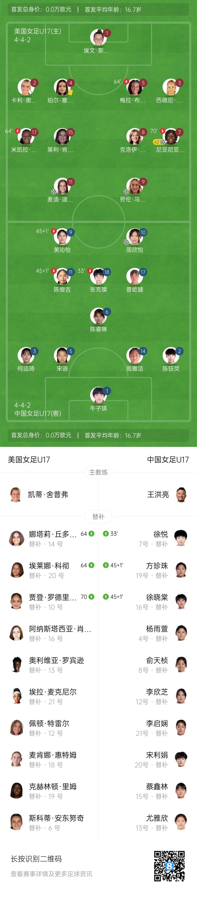 伤停补时2分钟。全场结束,中国女足U17以2-5不敌美国女足U17。