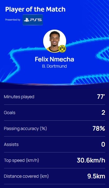 2射正2进球,欧冠官方:恩梅查当选多特4-2哥本哈根一役全场最佳