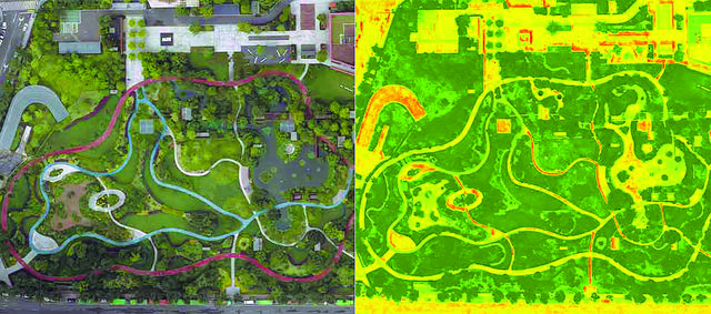 城市公园卫星图(上)和单曝光高光谱相机拍摄的城市公园光谱图(下)。