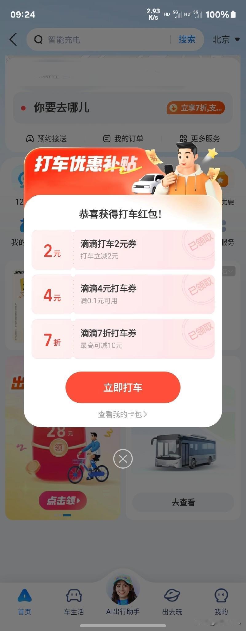 用支付宝,滴滴打车这一波羊毛薅到!一共三个方法可以得到抵值券。 1打开支付宝界面,点击出行(切记不要点击滴滴打车)这时页面会显示优惠券,像我这次得到滴滴打车2元,滴滴打车4元,滴滴7折打车券,根据你使用的频率,APP会给你不同的金额打车券。但是在一段时间之内使用。一般为一周。 2打开支付宝积分兑换,搜索栏搜索”打车”下边会出现不同积分所兑换的金额抵值券。 3支付宝界面,打开消费圈,打开消费券,点击出行,这里会有滴滴打车抵值券,还有小猪打车抵值券。 对于经常打车的人,这个方法希望能帮助到您,这波羊毛就看到你们能不能薅到。大家还有什么方法?可以在评论区说明滴滴出行 滴滴打车