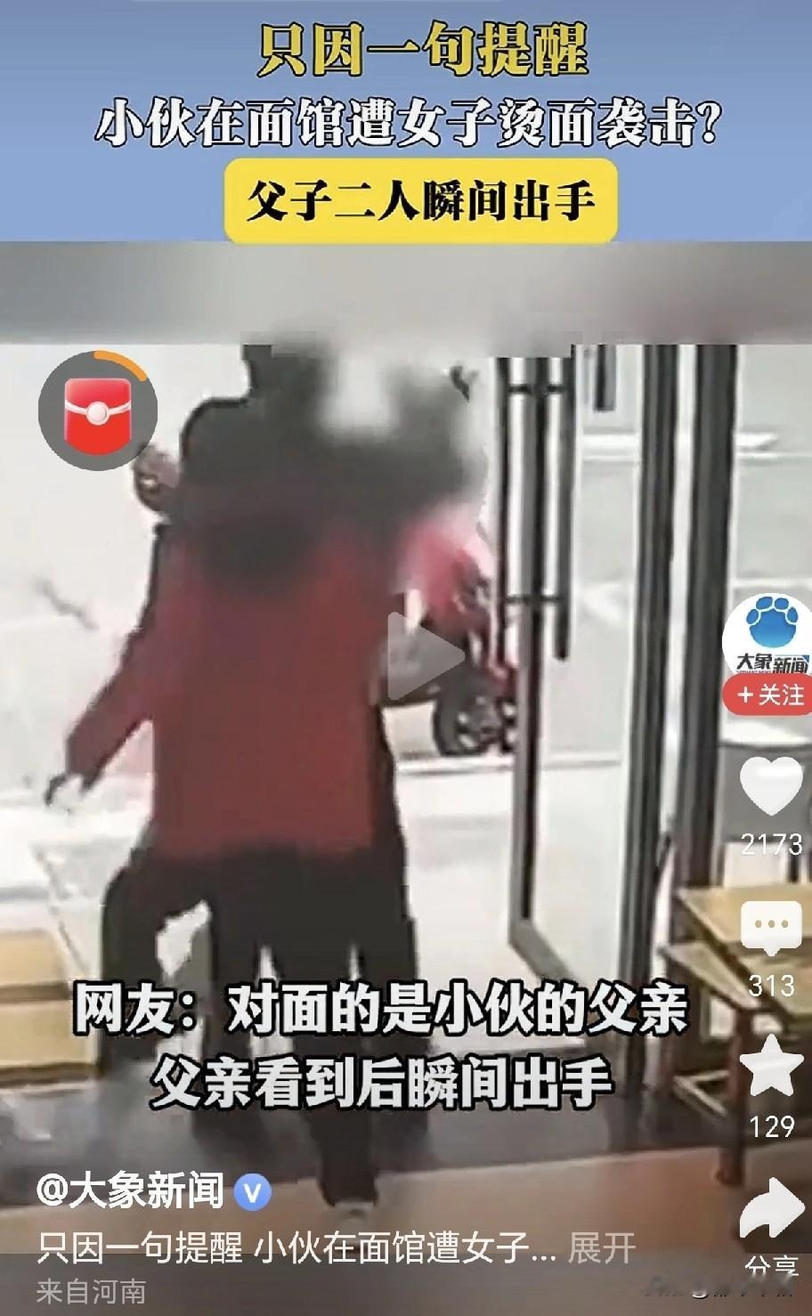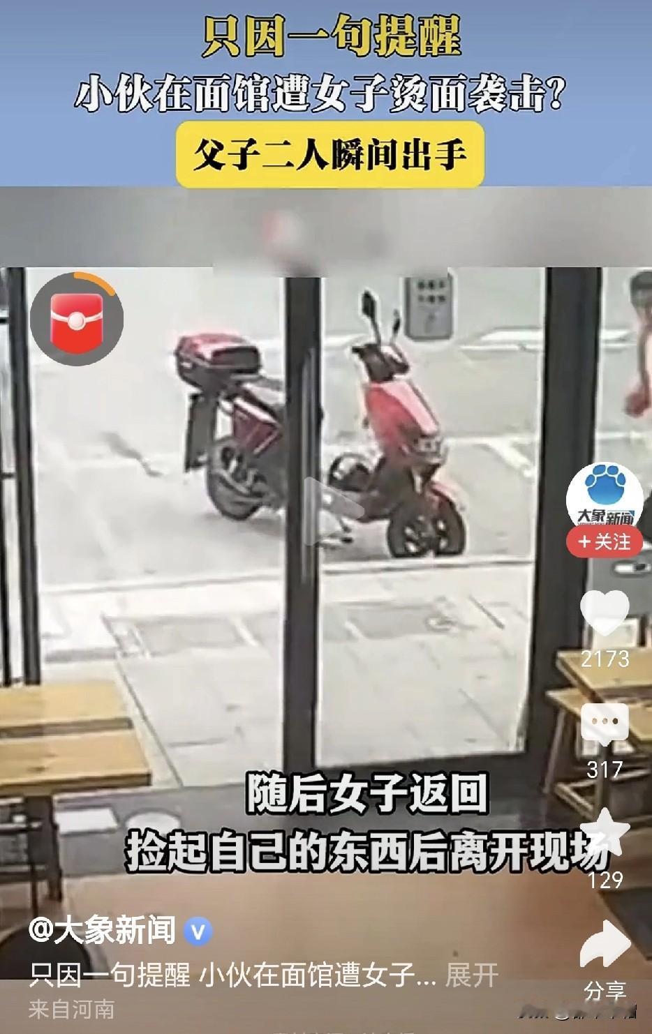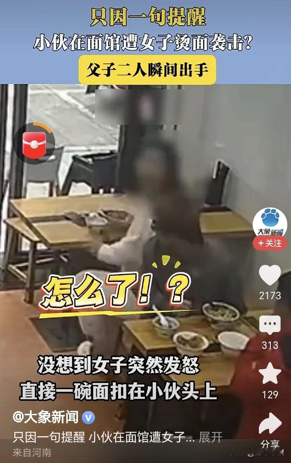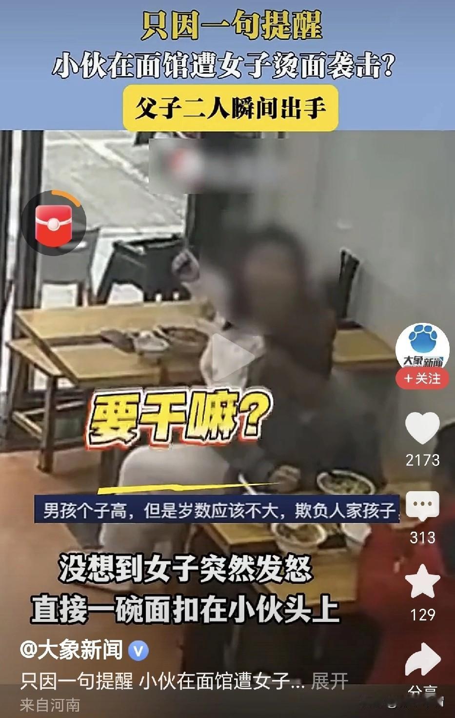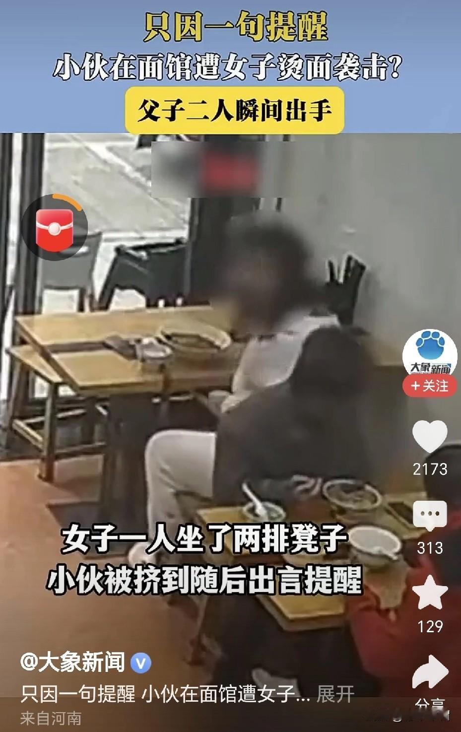 一言不合,滚烫的汤面扣到对方头上!近日,杭州一家面馆里。一位胖胖的女子吃面时占位太多,挤到了他后面同样在面馆就餐的小伙子。小伙子只是提醒了她一下,意思是请她不要挤占别人的座位。女子好像受到别人的欺凌似的,反问一句:怎么了?要干嘛?随即将正在吃的一碗热汤面扣到小伙子的头上。小伙子对面,是跟他一起来面馆就餐的父亲,见到儿子被欺负,立马站起来将胖女子推出面馆。 从视频上看,胖女子确实挤占了别人的空间,让她身后的小伙子坐得非常局促。小伙子没有指责,没有谩骂,仅仅是一句提醒,胖女子何至于发怒?这反应也过于激烈了吧!如果说小伙子出言不逊,或者谩骂推搡你了,出于戒备,你反应过激点还情有可原。可事实是你挤占别人的座位在先,别人只是一句提醒。如此过激的反应就显得欺人太甚了。 如果小伙子长得人高马大,一脸的凶相,估计胖女子会好好道歉并让出挤占的空间。就是因为小伙子长得矮小,估计父子俩都是一脸善相。胖女子才这样嚣张跋扈。儿子被女子如此欺负了,明明自己一方有两个男人,实力碾压胖女子一方,做父亲的只是把胖女子推出面馆。这足以证明这对父子的善良和不想惹事。 也许,被欺负的小伙子父子俩看上去像外来务工者,胖女子觉得他们好欺负,而自己向来骄横跋扈惯了,老虎屁股,摸不得。但是,这不是在你家里,胖女子如此蛮不讲理,出手伤人,如果小伙子被烫伤了,治疗费、误工费都跑不了。如果小伙子被烫伤的情况比较严重,依照相关法律法规,胖女子还要受到相应的处罚。为自己的行为付出代价。 女人出门在外,要学会保护自己。但是不能以此为借口,对他人实施欺凌。面馆有摄像头,有其他顾客,胖女子完全没有必要如此“警惕”!