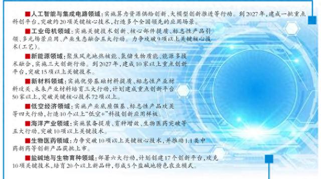 人工智能与集成电路领域。实施算力资源供给创新、大模型创新推进、智能场景牵引赋能以及电路材料提质增效、半导体制造创新突破等行动。到2027年,建成一批重点科创平台,突破约20项关键核心技术,打造多个全国领先的应用场景,构建特色产业集群协同创新生态。