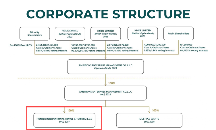 2025年10月21日,来自阿联酋的阿联酋旗猎国际旅行有限责任公司的实质控股股东AMBITIONSENTERPRISEMANAGEMENTCO.L.L.C(以下简称旗猎国际旅行)成功在美国纳斯达克上市,其股票代码为AHMA。其于2024年3月12日在SEC秘密递表,后于2025年2月7日公开披露招股书。