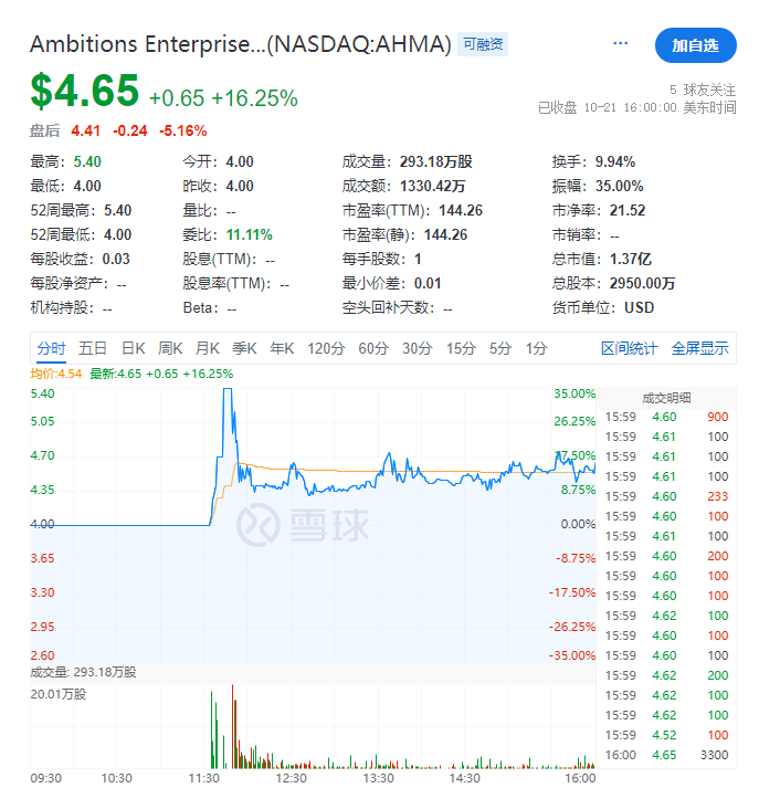 截至首日(2025年10月21日)收市,旗猎国际旅行(AMHA)每股收报4.65美元,稍涨16.25%,目前市值约1.37亿美元。