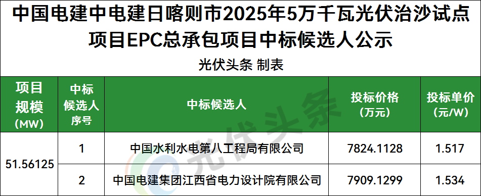 中国水利水电第八工程局有限公司、中国电建集团江西省电力设计院有限公司2家企业入围,投标单价1.517~1.534元/W。