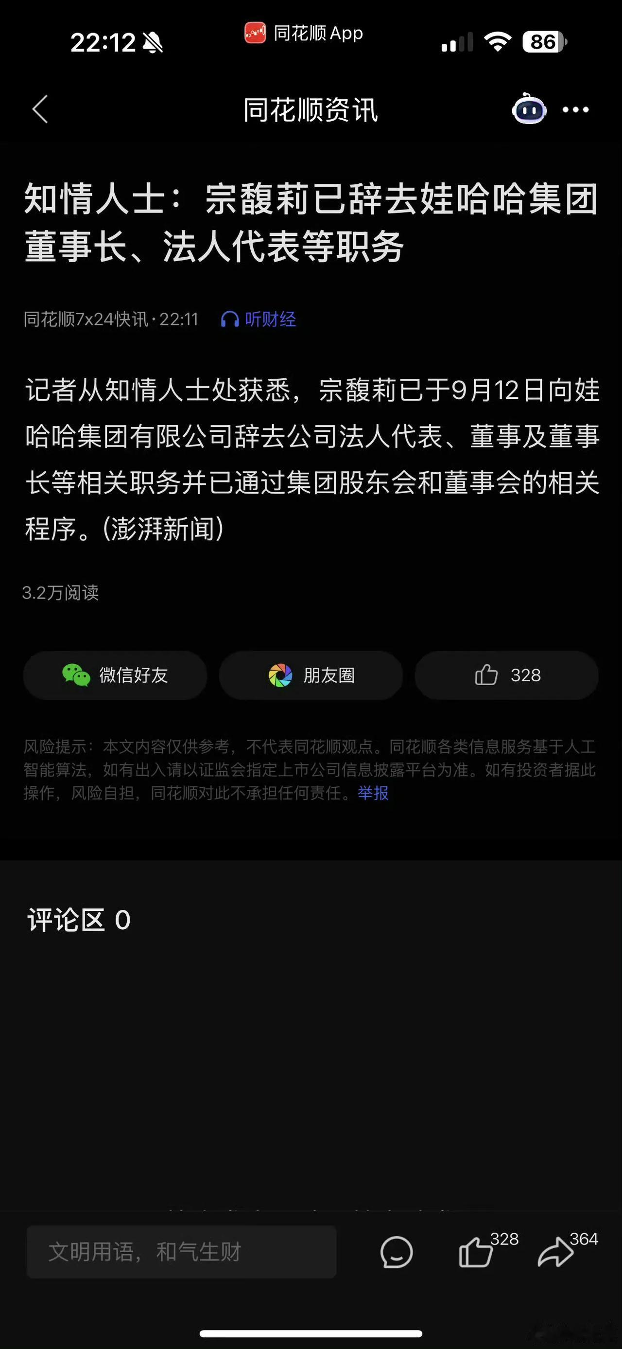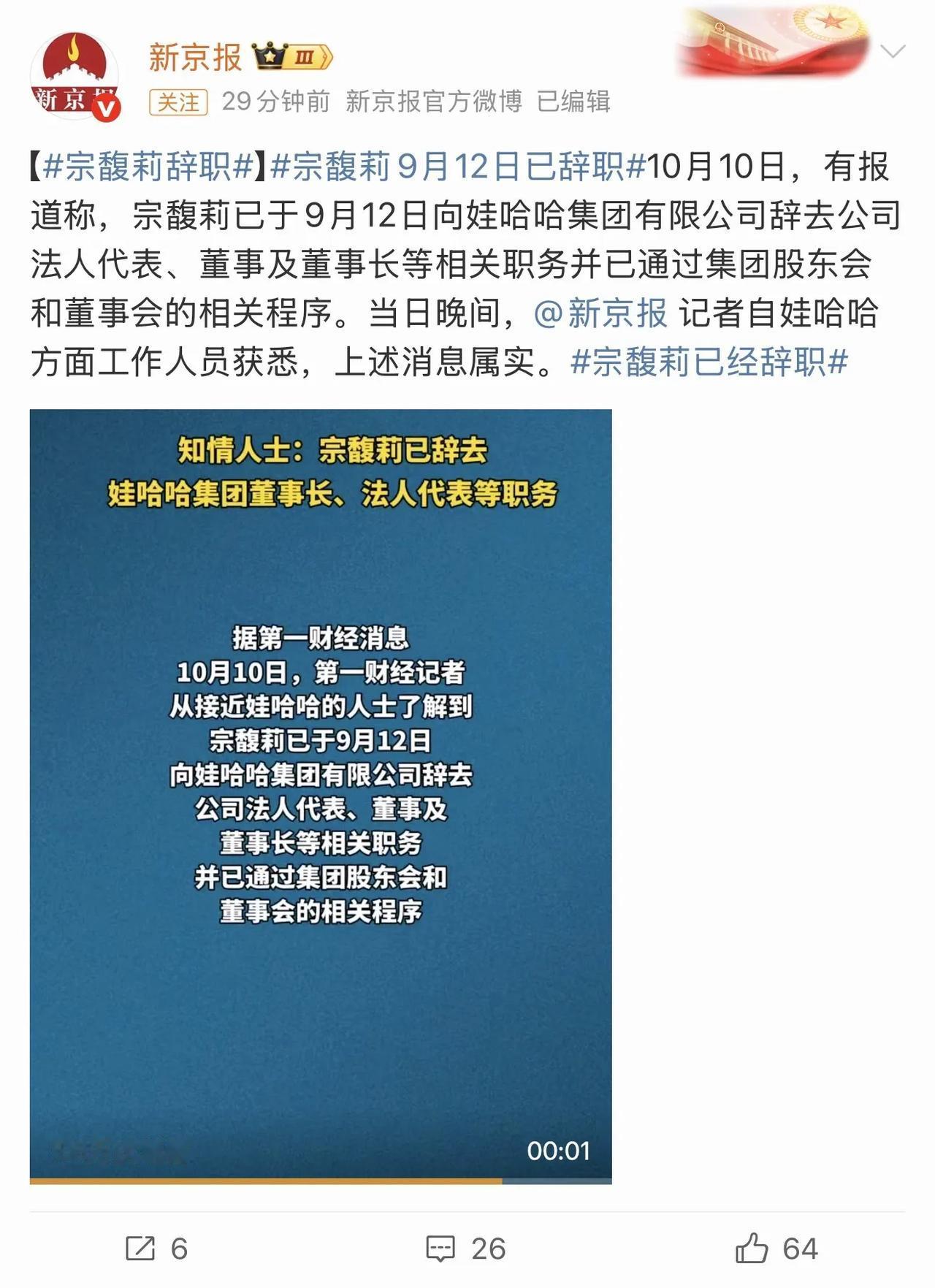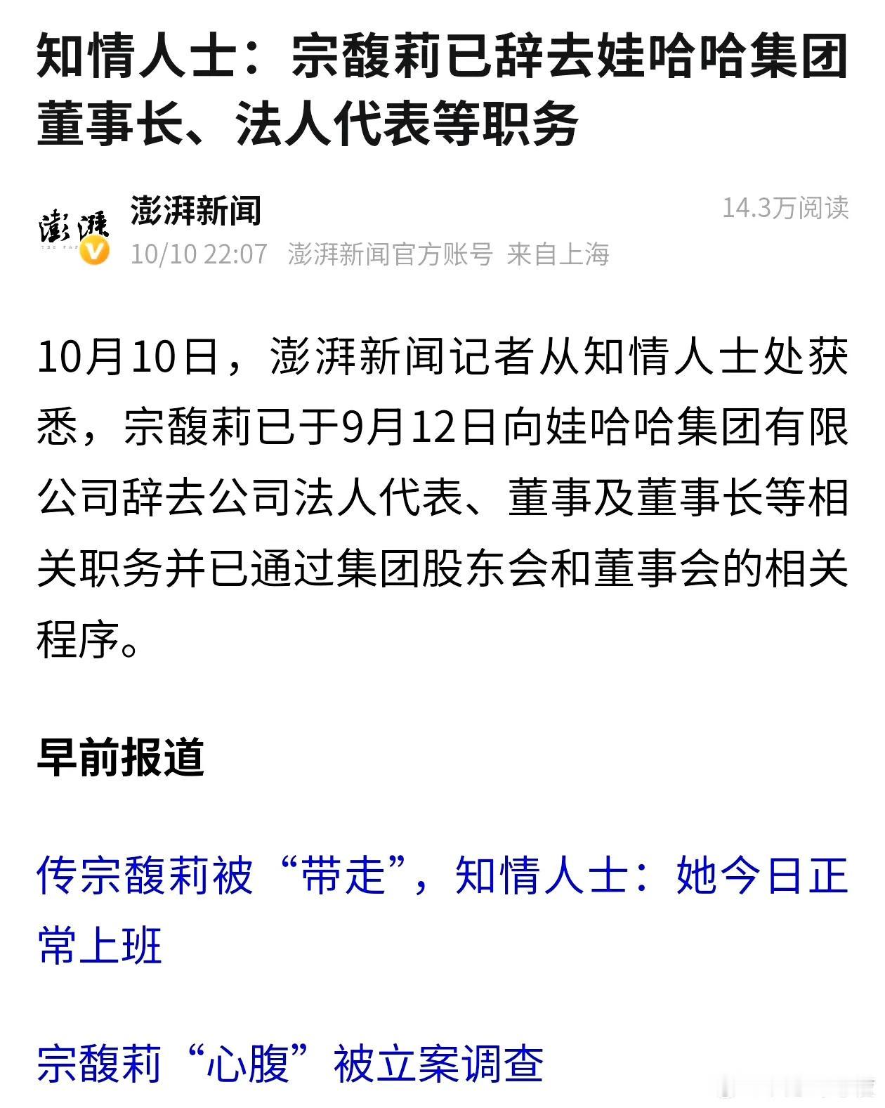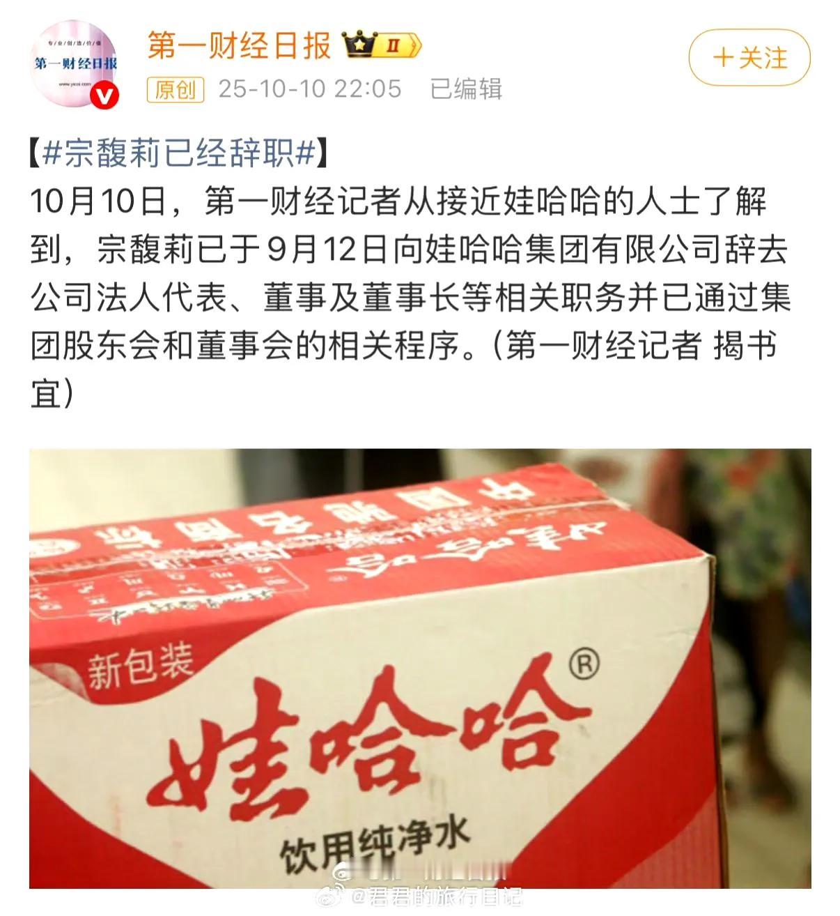 简评:确实震惊! 但辞职不代表出局,还很难说 有报道称,宗馥莉已于9月12日向娃哈哈集团有限公司辞去公司法人代表、董事及董事长等相关职务并已通过集团股东会和董事会的相关程序。当日晚间,记者自娃哈哈方面工作人员获悉,上述消息属实。