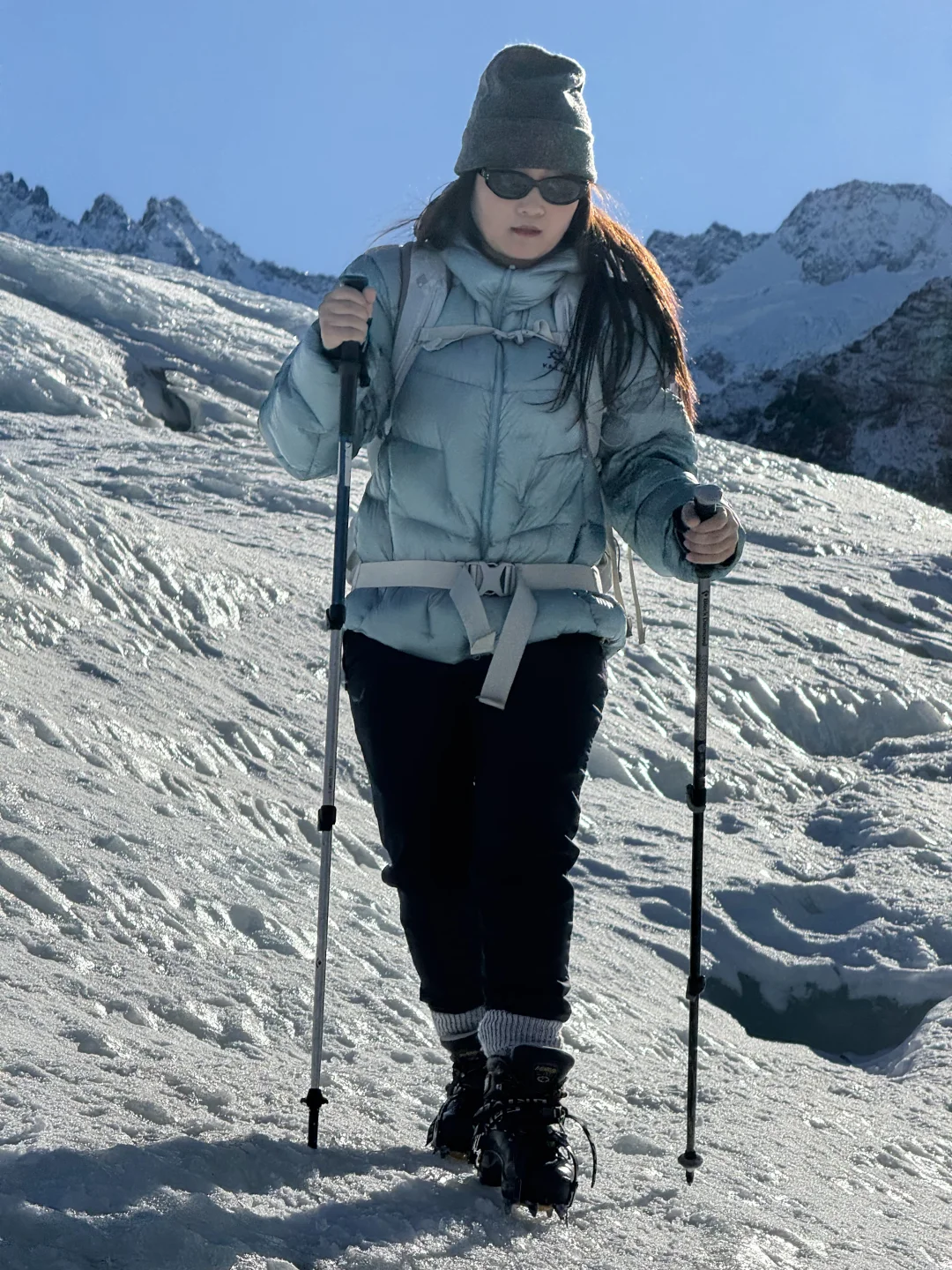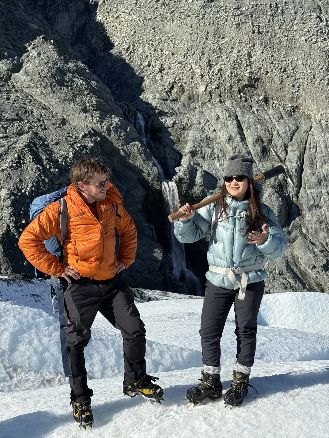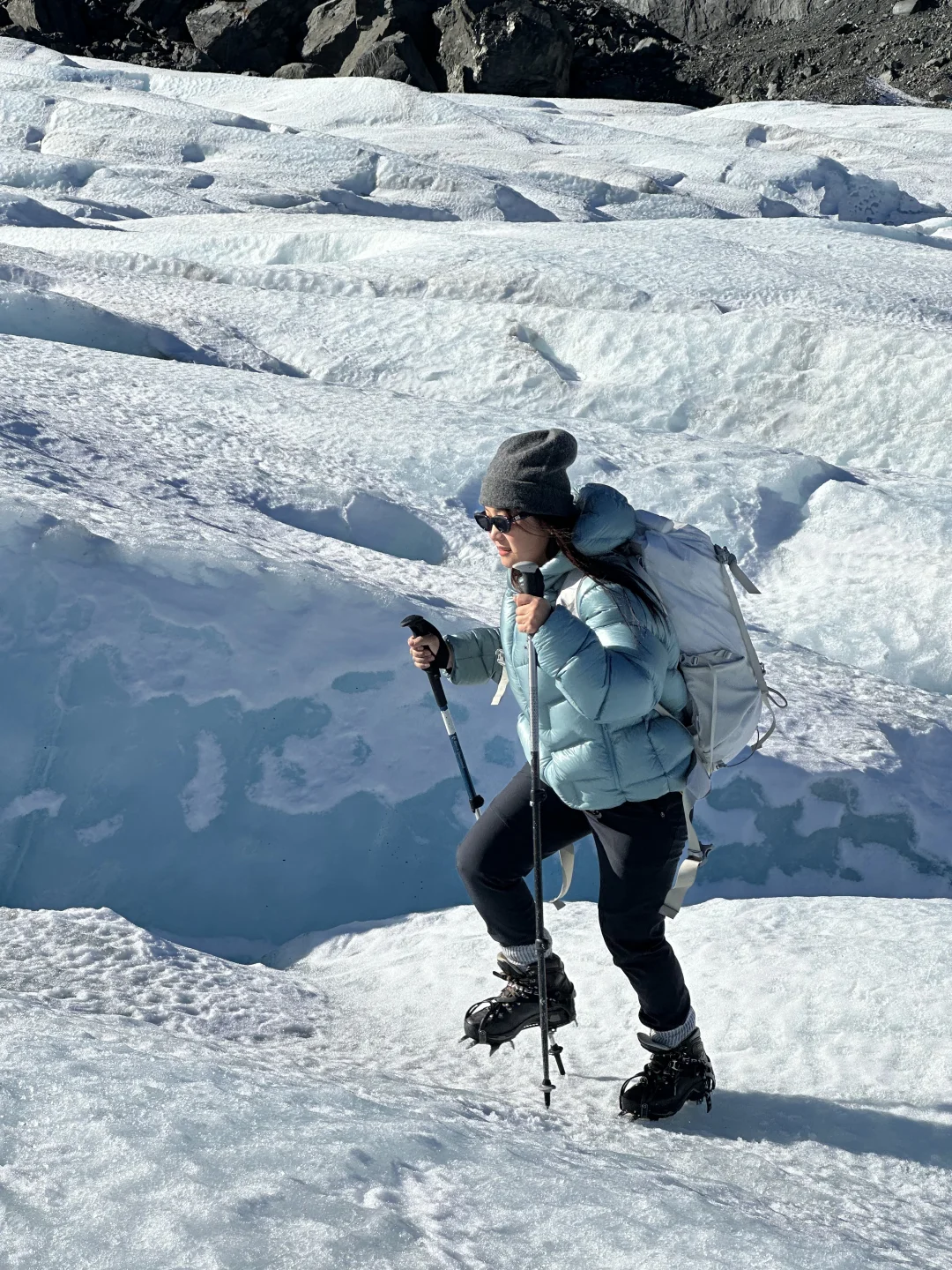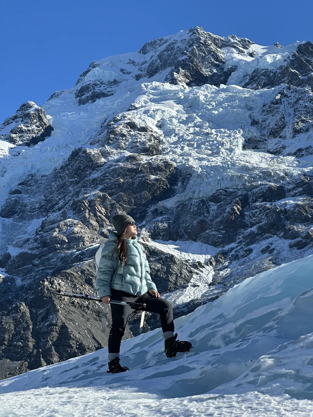 刚看完李现新西兰宣传片 马上又想再去新西兰了 这次给大家安利李现同款的塔斯曼冰川 . 去新西兰旅行 不管你喜不喜欢徒步 都给我狠狠留2天时间给这个雪山小镇MT- Cook 可以近距离接触冰川和雪山🏔️ 对于新手也毫无难度 住宿建议住在mtcook,第二天驱车15分钟可以抵达🛬 . 新西兰徒步资源很丰富,这次主要围绕库克山徒步!库克山海拔为3755m,是新西兰最高的山峰,两侧为胡克冰川(西)和塔斯曼冰川(东) . 1️⃣Kea Point Track 作为Hooker的平替,这是一条走到Muller lake湖边的下行路线,全程1.48公里,较为平缓,去程没有爬升,垂直下降88米,往返 1.5 小时,终点是蓝绿色的冰川湖,视觉上离雪山非常近! 2️⃣Tasman 冰川 塔斯曼冰川徒步行程亮点 ❶ 直升机视角俯瞰冰川奇观 15分钟航程直达海拔1300m冰川腹地,坐在副驾上更有穿越冰川即视感 ❷ 冰川徒步初体验 必须跟tuan,主要有3个tour,其实没有很大差别 都会有专业向导带队,会在冰上2小时探索万年蓝冰洞、冰裂缝奇观,还能喝冰川水!纯英guide,给他安利了我们中国也有很多很美的雪山冰川! ⚠️会免费提供防风外套+防水靴+加厚羊毛袜+登山杖+冰爪 必备清单 其他自己可以注意的: ✔️ 3层保暖穿搭:速干衣+抓绒衣+冲锋衣 ✔️ 防晒三件套:墨镜(UV400)+防晒霜(SPF50+)+魔术头巾 ✔️ 防水双肩背包:装相机+零食+水(单肩包不让带上直升机) ⚠️血泪经验 ❶ 提前30分钟到场 换装备+安全讲解要40分钟,迟到的可能错过起飞 ❷ 一定要戴墨镜、擦好防晒霜 真的非常晒!而且冰川上反光非常强,墨镜必须,最好戴防晒口罩或魔术脖套 ❸ 冰洞禁忌 不要自己随便走,紧跟向导,有的冰下可能一米多深,一定要小心!