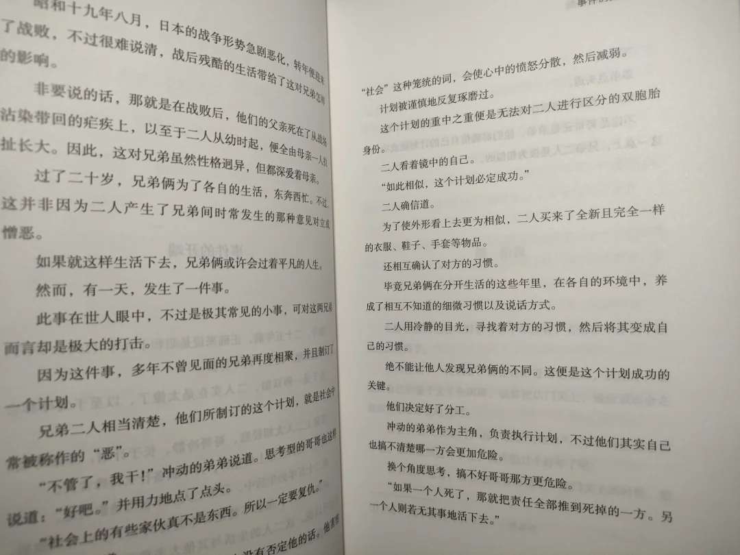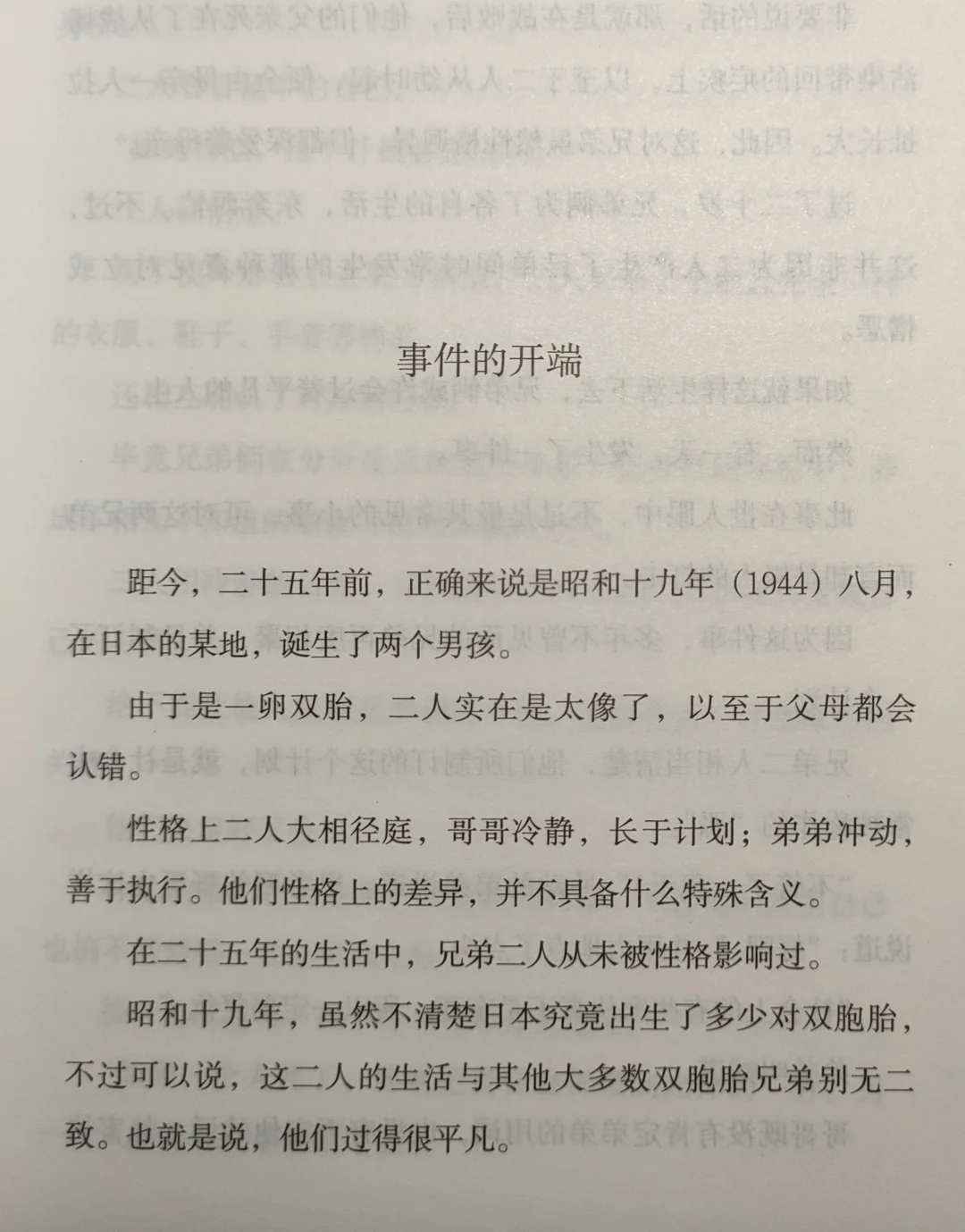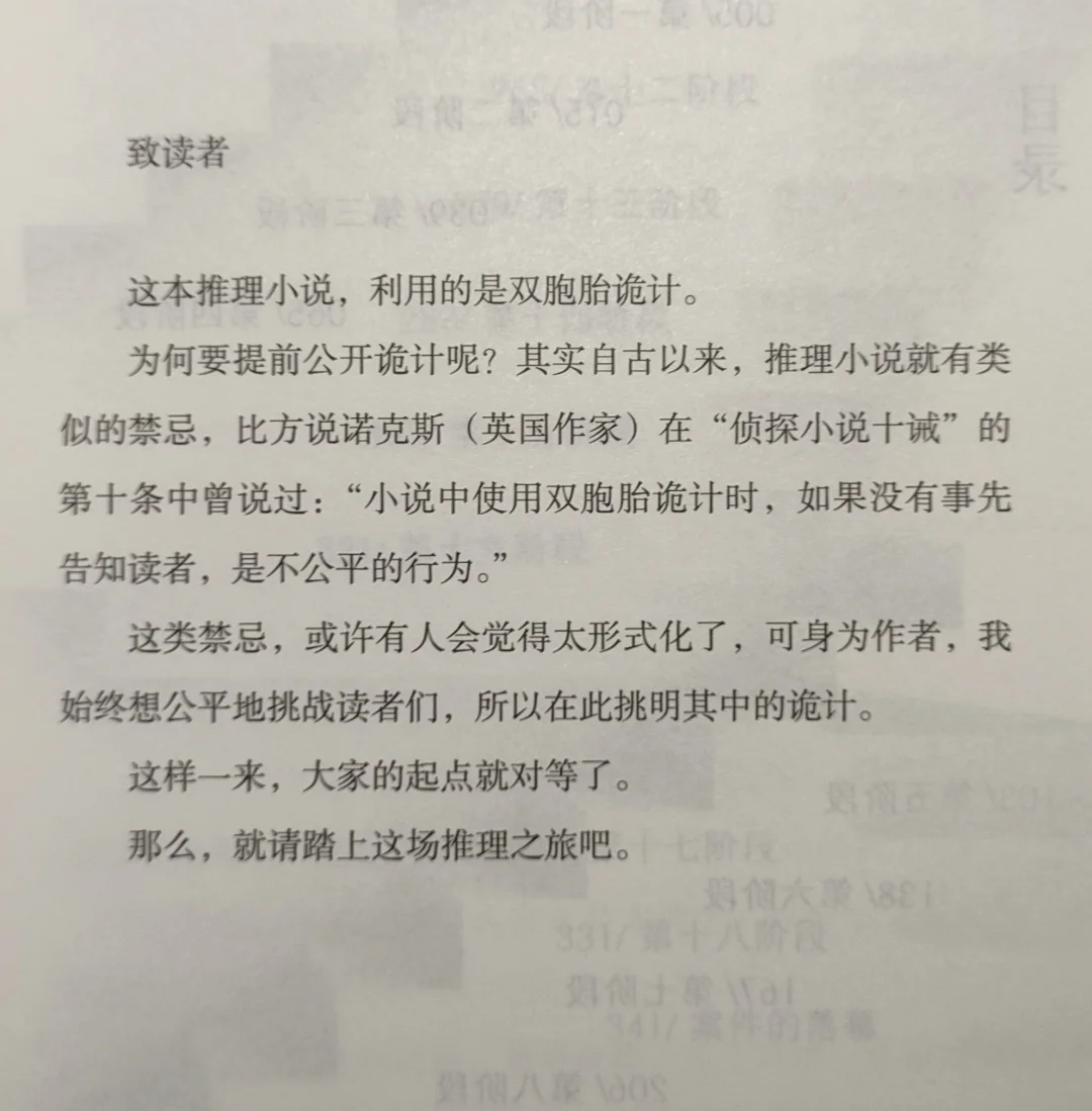 二是作者开篇即“泄底”,摆明自己使用了双胞胎诡计,并向读者发起挑战。