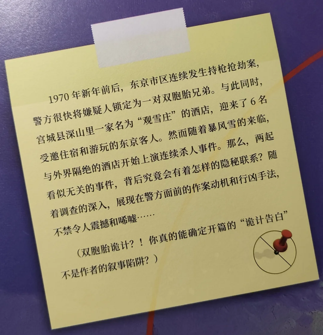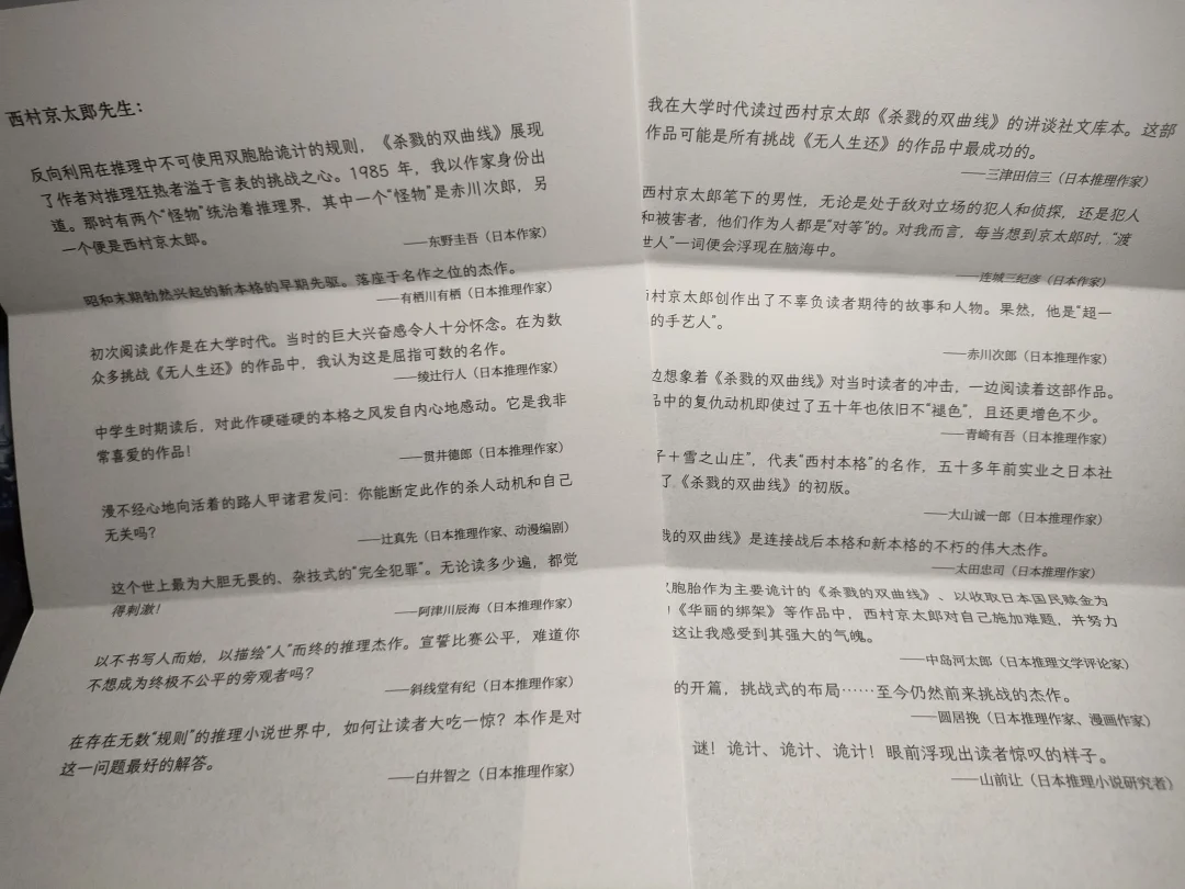 ps.随书附带的一封信(P5-6),打开看原来是收集了各大知名推理作家关于本书的评价,出版方用心了。