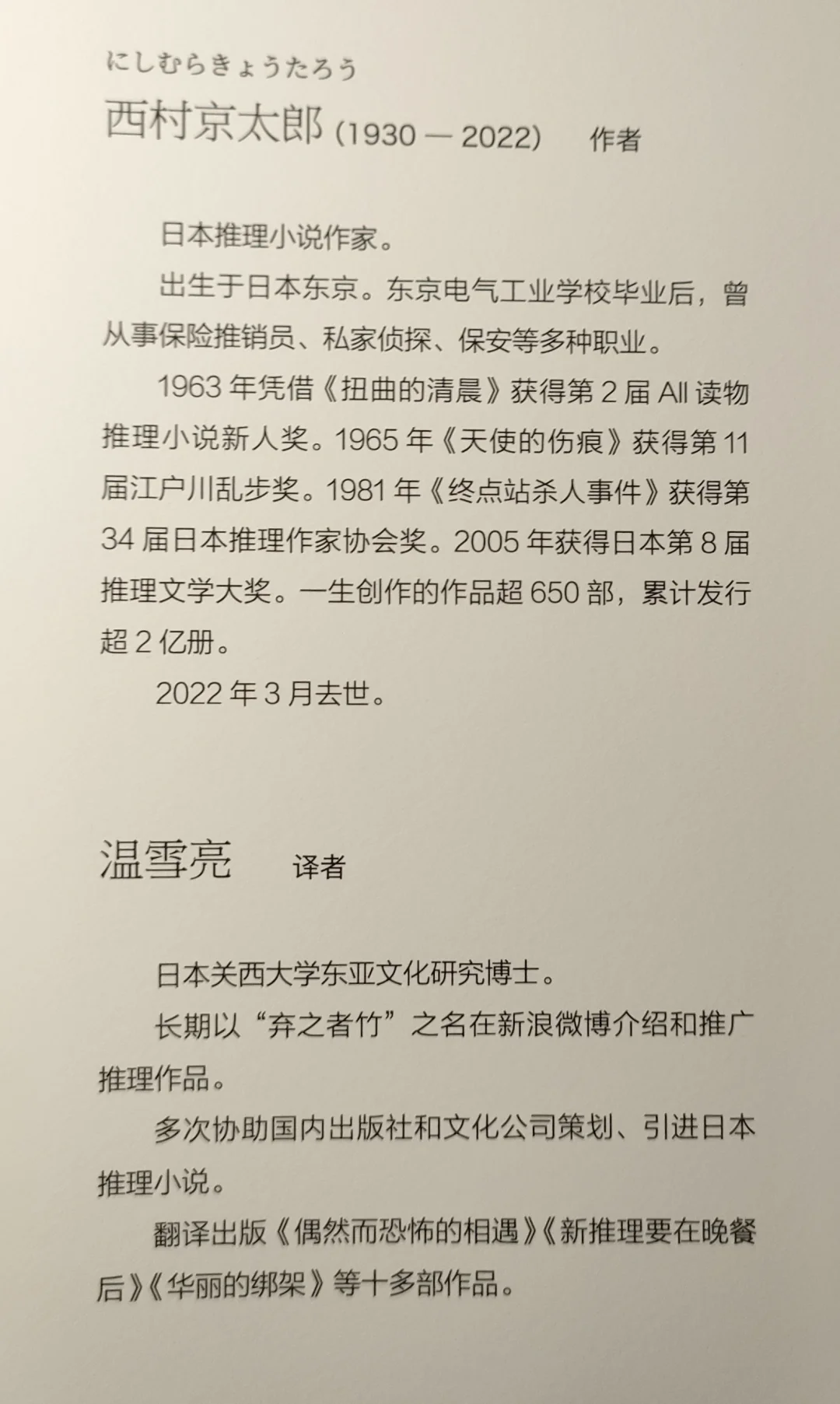 无人生还模式和双胞胎诡计,虽然是推理小说中司空惯见、用烂了的元素,西村却写出了自己的新意。哪怕你已看穿真相,也依然会被故事吸引,在感慨作者流畅、老练文笔的同时,忍不住一气呵成、津津有味地读完。