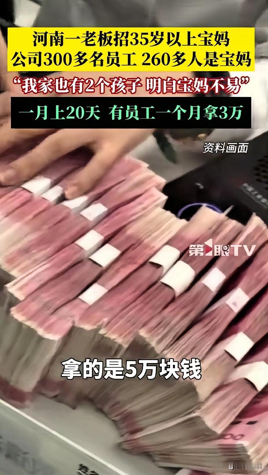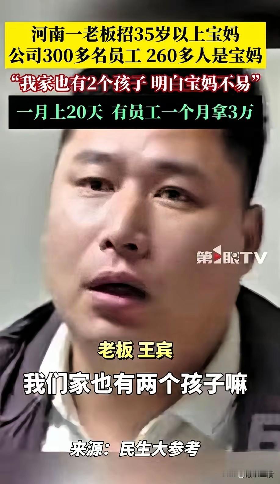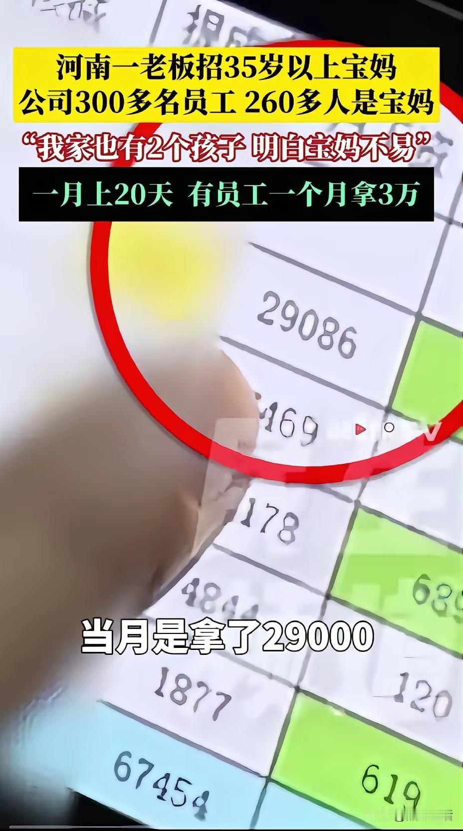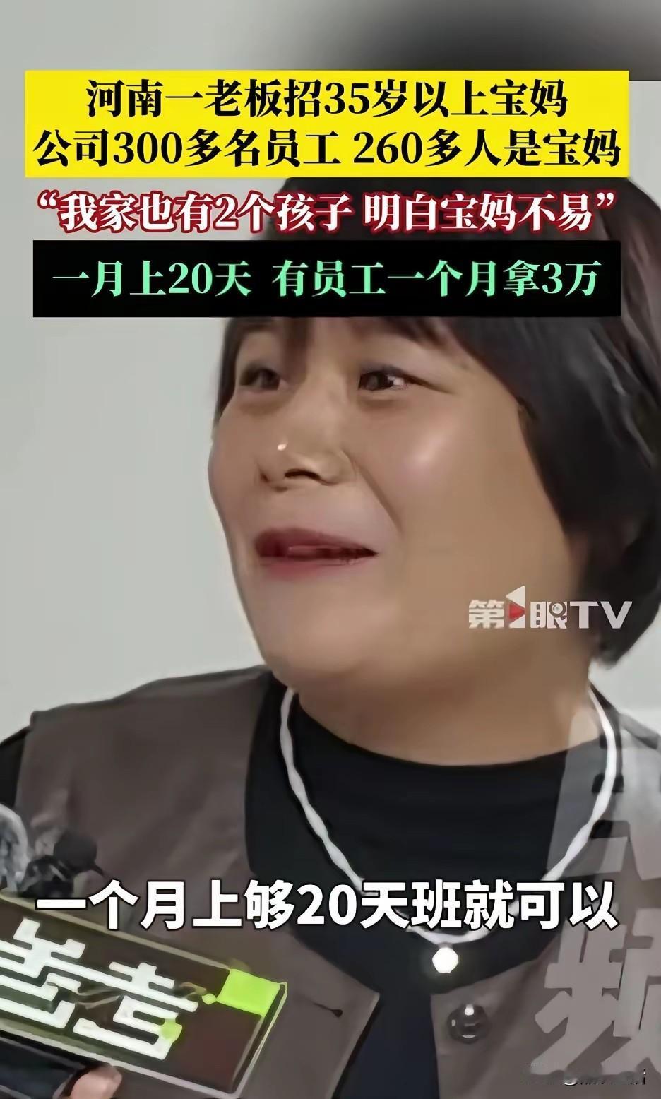 河南第二个“胖东来”?挣100万,给员工85万!38岁宝妈,在“郑州千百味”,第二个月挣3万,第三个月就挣到5万元! 郑州千百味公司,是卖冻品的,有300名员工,260人都是“宝妈”, 许多宝妈第二个月都能有“上万”元收入, 总经理王宾说,我也有两个孩子,知道“宝妈”的难处, 我们实行“弹性工作制”,员工可以“晚来早走”,不耽误早上送,下午接娃! 这样的公司不要太好了, 像我们这些宝妈,35岁以后,再找工作,想着双休,或者兼顾接送孩子,很难! “千百味”的员工,8.00送了娃就去上班,中午11.30接娃,下午再去上班,如果孩子生病在家,还可以申请调班,每月可以休10天,可以预支工资, 这多有归属感! 宝妈们也很感激公司,大家工作都很卖力,有事同事间可以自行调整时间, 既不耽误家里,又能挣钱! 多好! 河北也没有这样的企业?羡慕