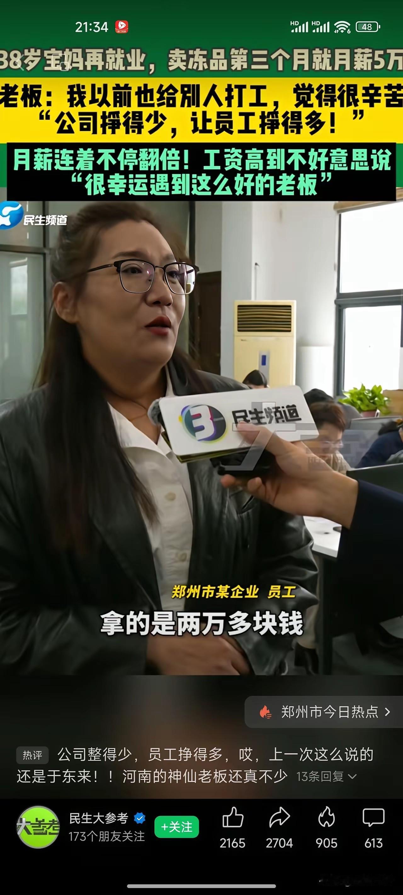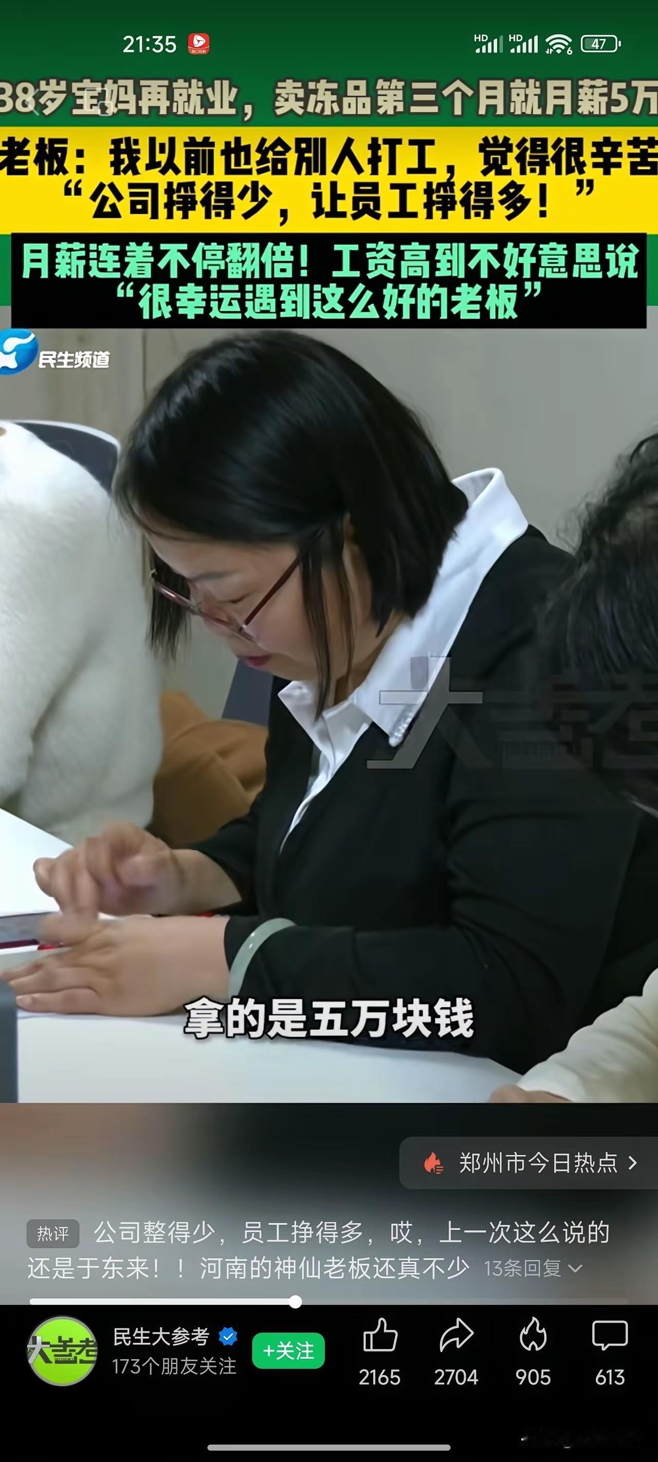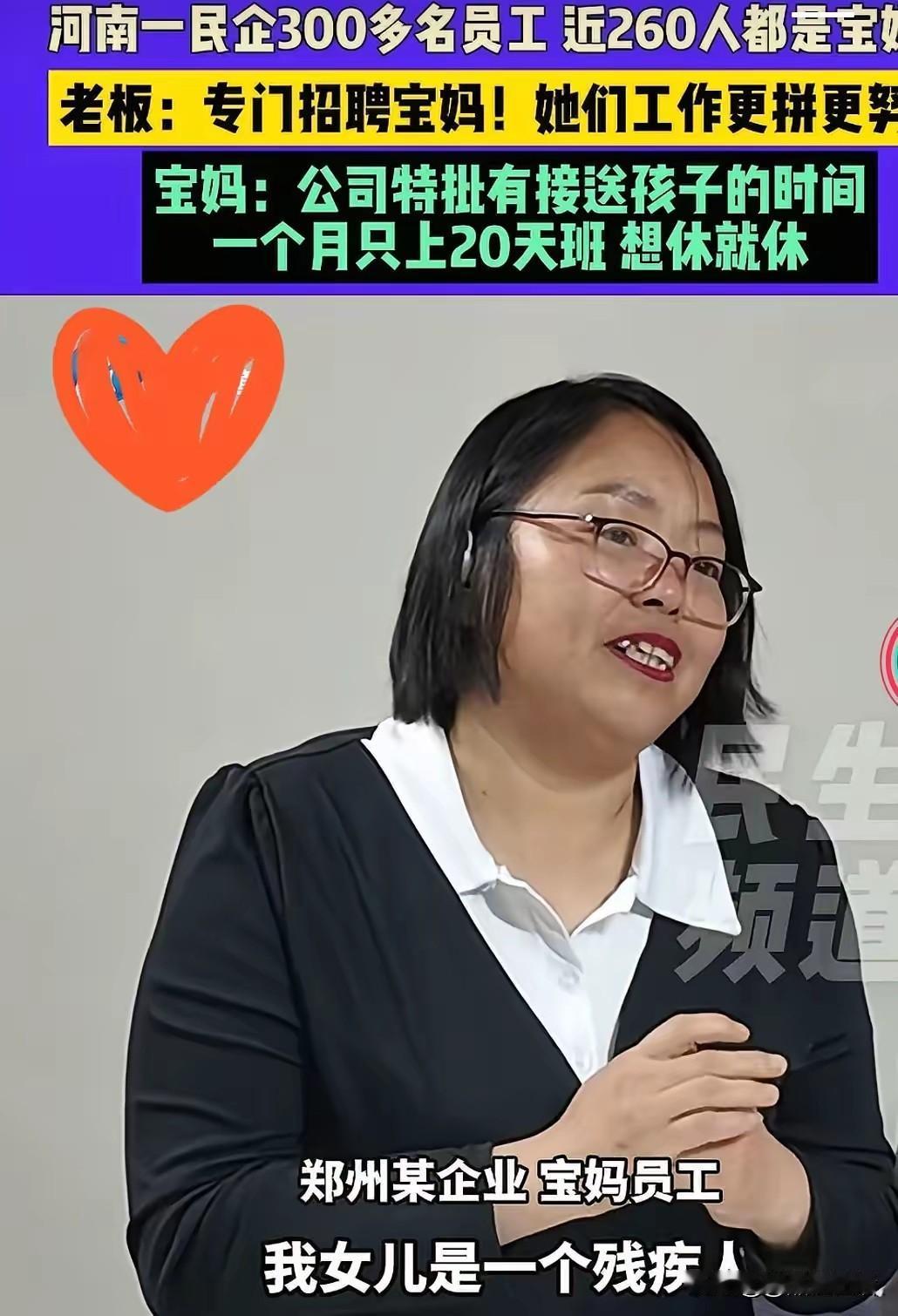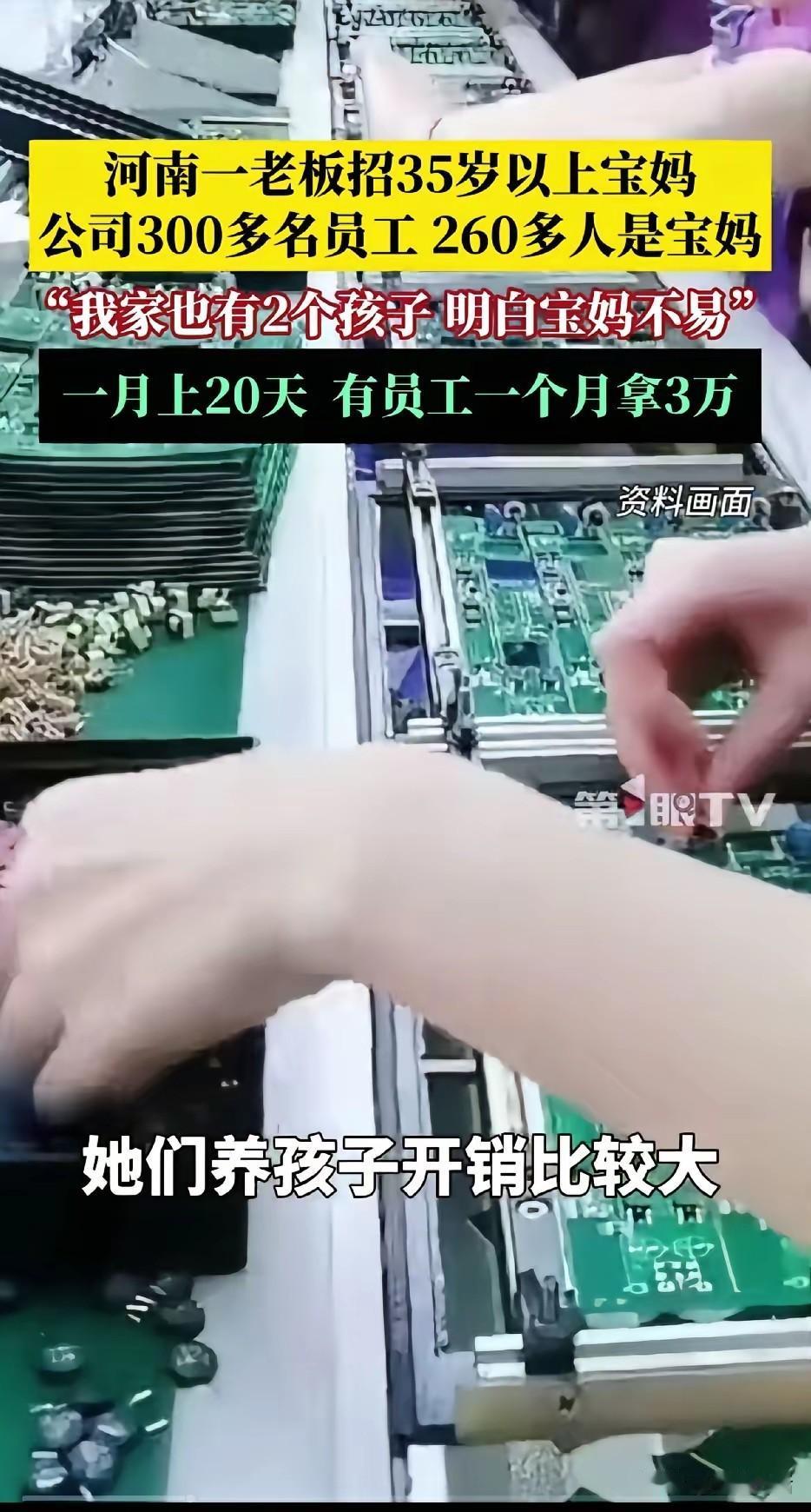 河南第二个“胖东来”?挣100万,给员工85万!38岁宝妈,在“郑州千百味”,第二个月挣3万,第三个月就挣到5万元! 郑州千百味公司,是卖冻品的,有300名员工,260人都是“宝妈”, 许多宝妈第二个月都能有“上万”元收入, 总经理王宾说,我也有两个孩子,知道“宝妈”的难处, 我们实行“弹性工作制”,员工可以“晚来早走”,不耽误早上送,下午接娃! 这样的公司不要太好了, 像我们这些宝妈,35岁以后,再找工作,想着双休,或者兼顾接送孩子,很难! “千百味”的员工,8.00送了娃就去上班,中午11.30接娃,下午再去上班,如果孩子生病在家,还可以申请调班,每月可以休10天,可以预支工资, 这多有归属感! 宝妈们也很感激公司,大家工作都很卖力,有事同事间可以自行调整时间, 既不耽误家里,又能挣钱! 多好! 河北也没有这样的企业?羡慕