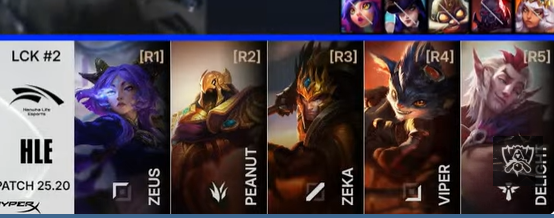 HLE选用:Zeus兰博、Peanut皇子、Zeka沙皇、Viper芸阿娜、Delight洛