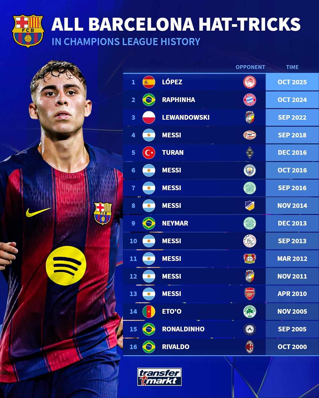德国转会市场盘点了在欧冠历史上上演过帽子戏法的巴萨球员: