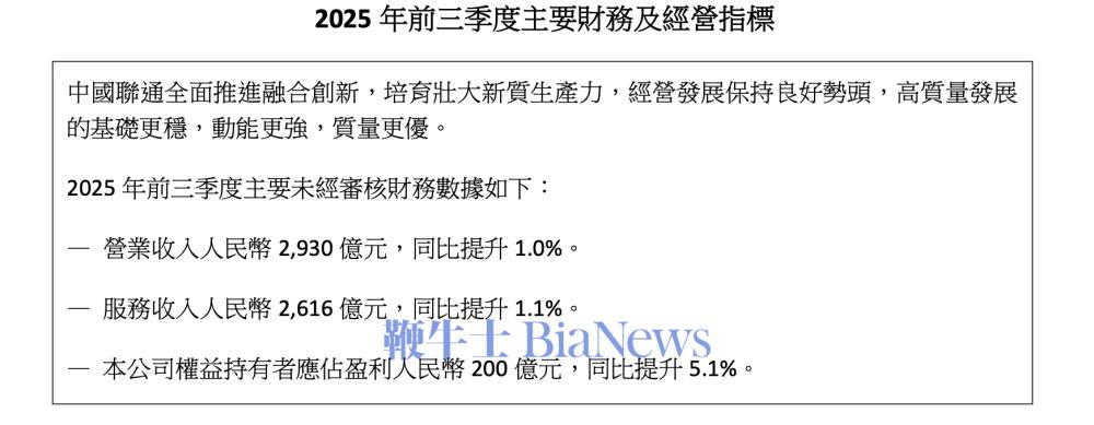 10月22日,中国联通(香港)在港交所公告称,前三季度营业收入人民币2,930亿元,同比提升1.0%。