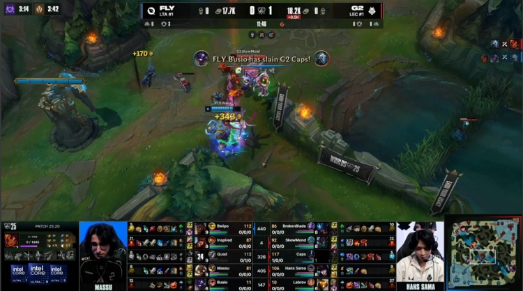 [11:41]中路2v2,Quad岩雀主动发难抬飞Caps维克托,但遭后者开大反杀,Busio牛头来中顶回Caps收掉其残血人头,双方打出1换1。