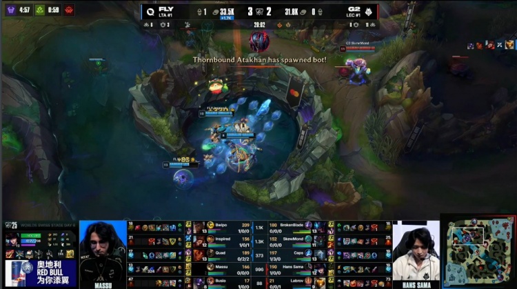 [32:01]小龙团,Buiso牛头开团被BB雷克塞顶飞打残,FLY直接撤退,G2拿到小龙听牌炼金龙魂。FLY经济领先5k。