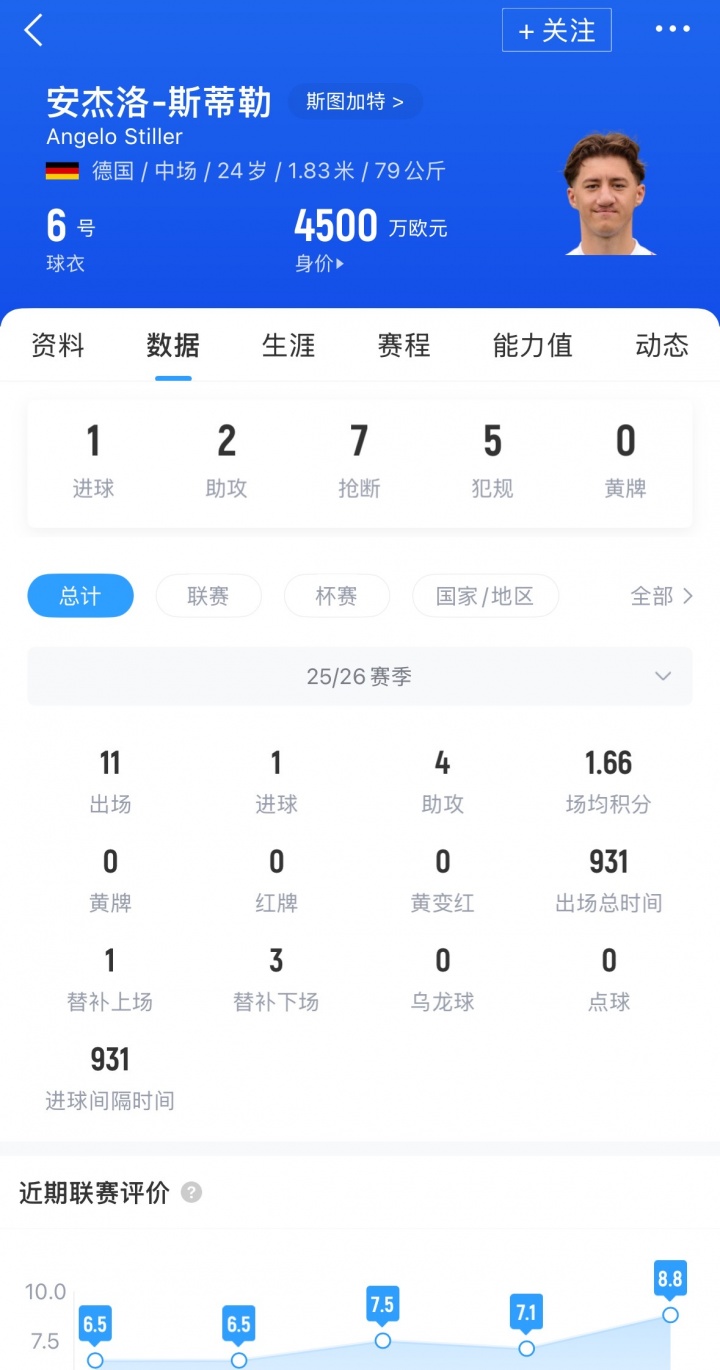 斯蒂勒现年24岁,司职中场,本赛季各赛事出场11次,贡献1球4助,目前斯蒂勒德转身价为4500万欧元