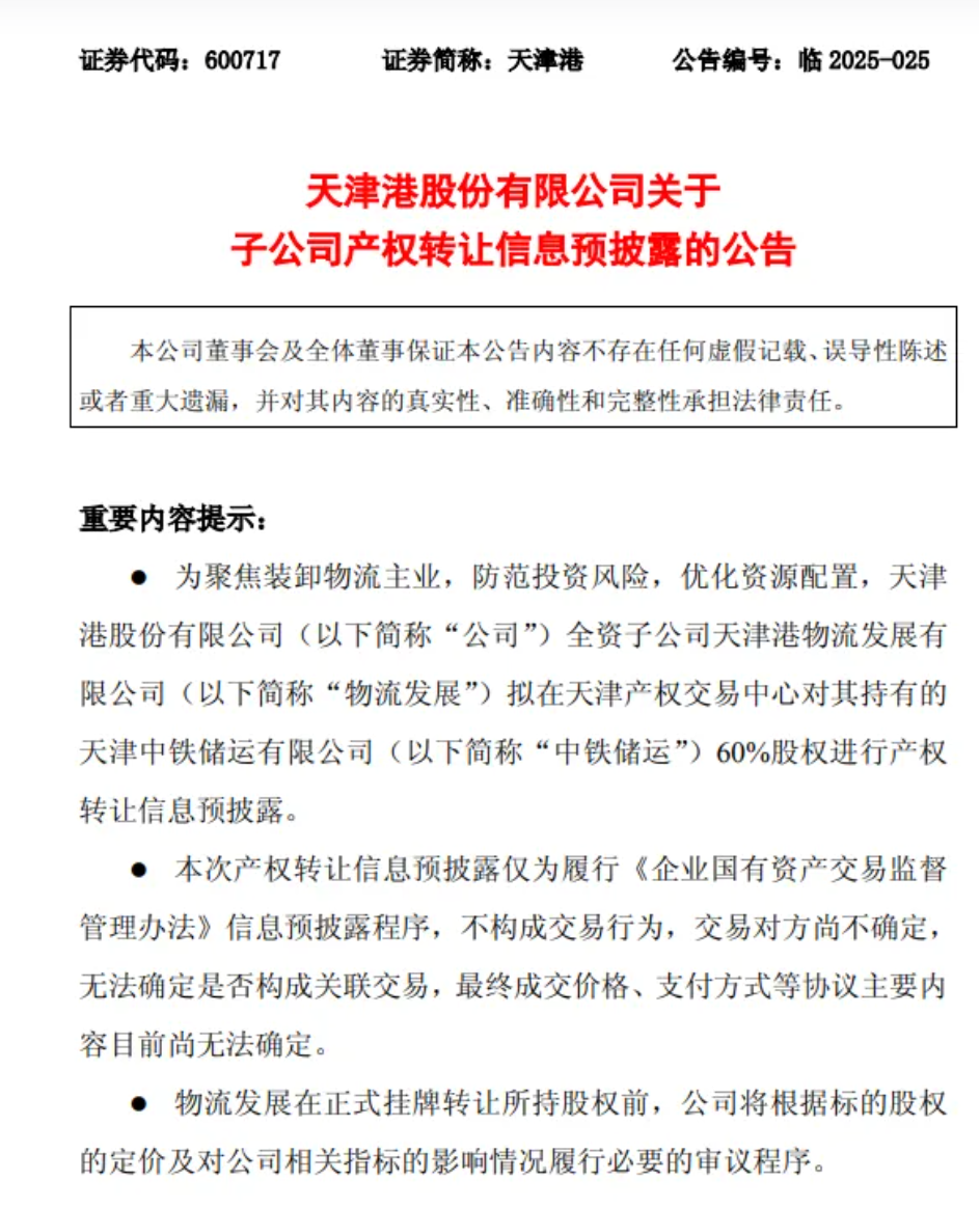 上证报中国证券网讯(年悦记者张雪)天津港10月22日公告称,公司全资子公司天津港物流发展有限公司(下称“物流发展”)拟对其持有的中铁储运有限公司(下称“中铁储运”)60%股权进行产权转让,旨在聚焦装卸物流主业,防范投资风险,优化资源配置。