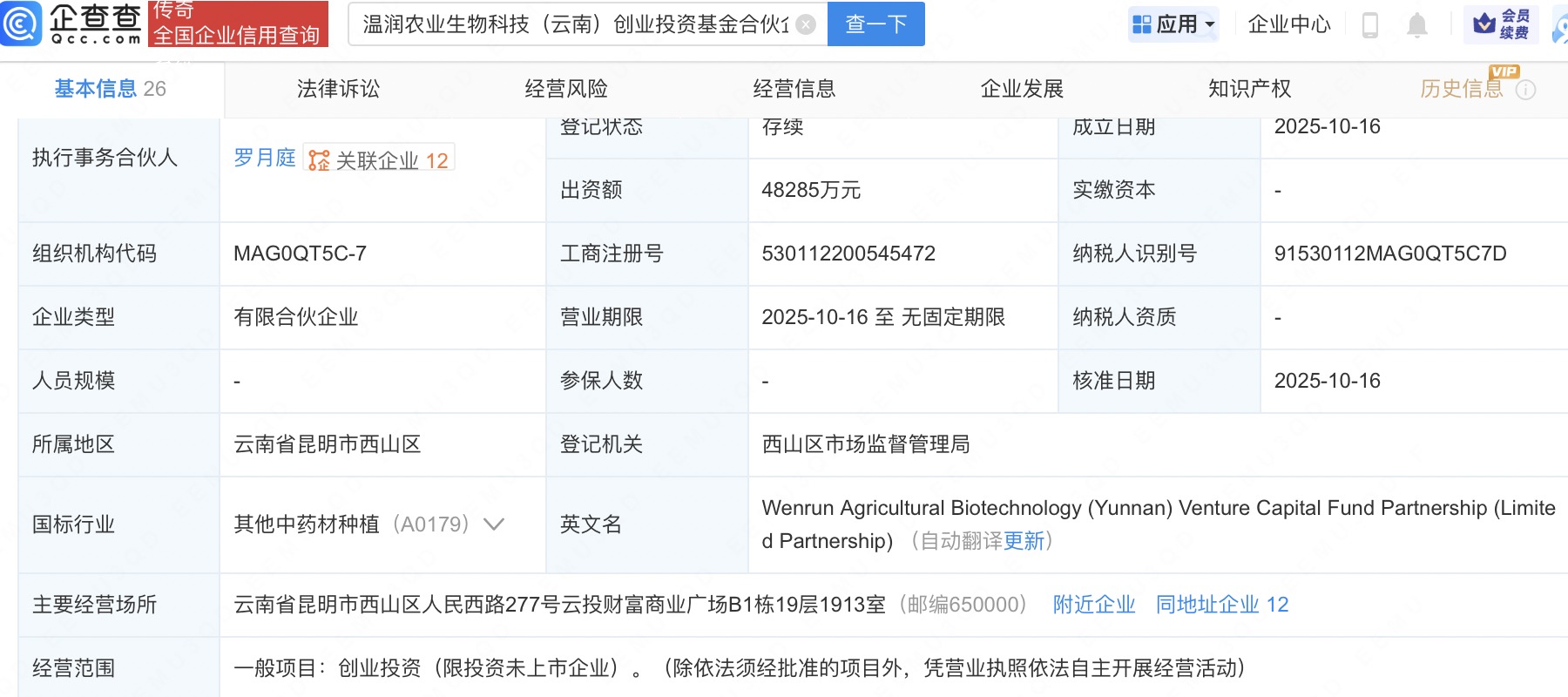 企查查APP显示,近日,温润农业生物科技(云南)创业投资基金合伙企业(有限合伙)成立,出资额约4.8亿人民币,经营范围为创业投资。企查查股权穿透显示,该企业由温氏股份(300498)全资子公司广东温氏投资有限公司、有友食品(603697)全资子公司有友食品重庆制造有限公司等共同出资。