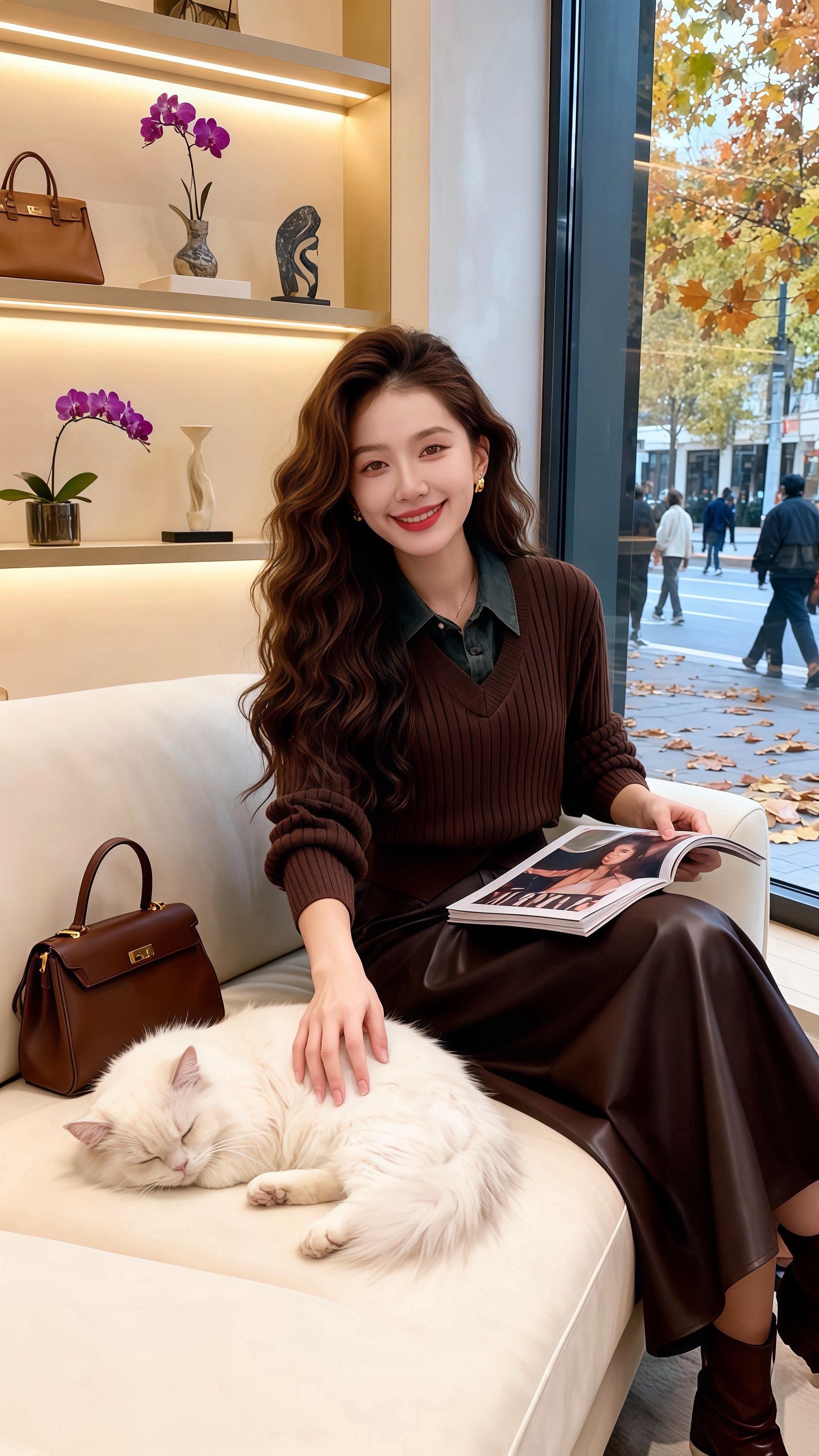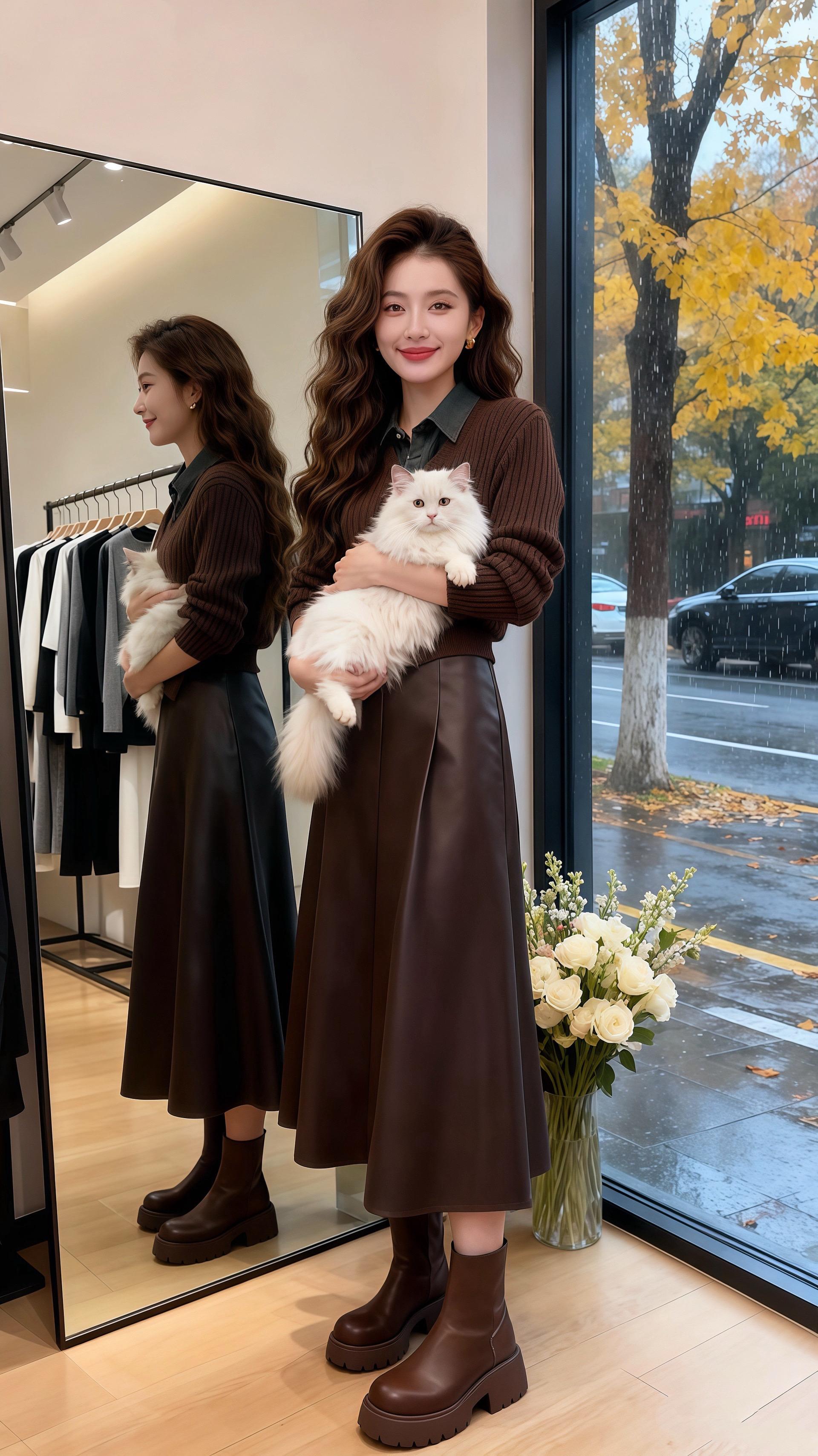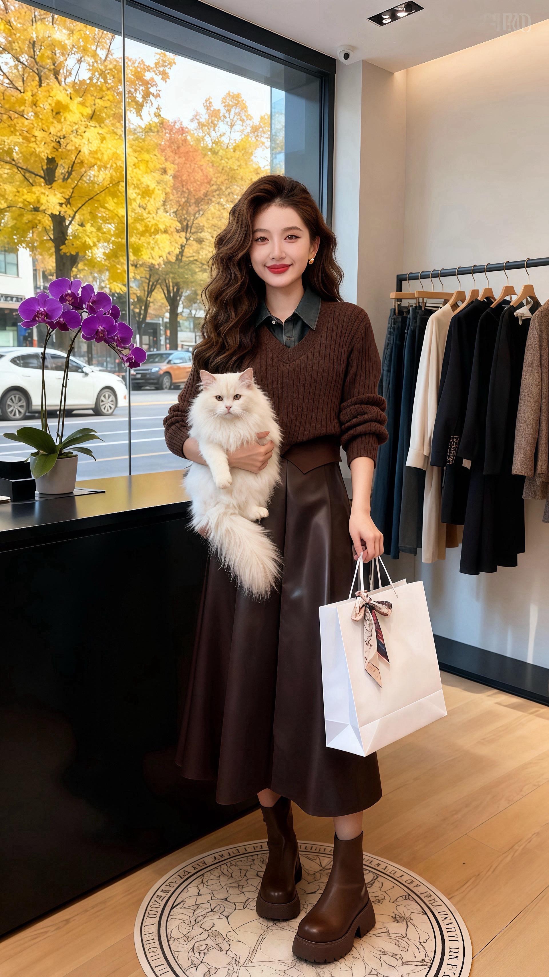秋日的午后,阳光透过女装店的弧形落地窗,在地板上洒下斑驳的暖黄。许妍抱着怀里的白猫,指尖轻轻划过它柔软的毛,目光却被镜中自己的身影吸引。