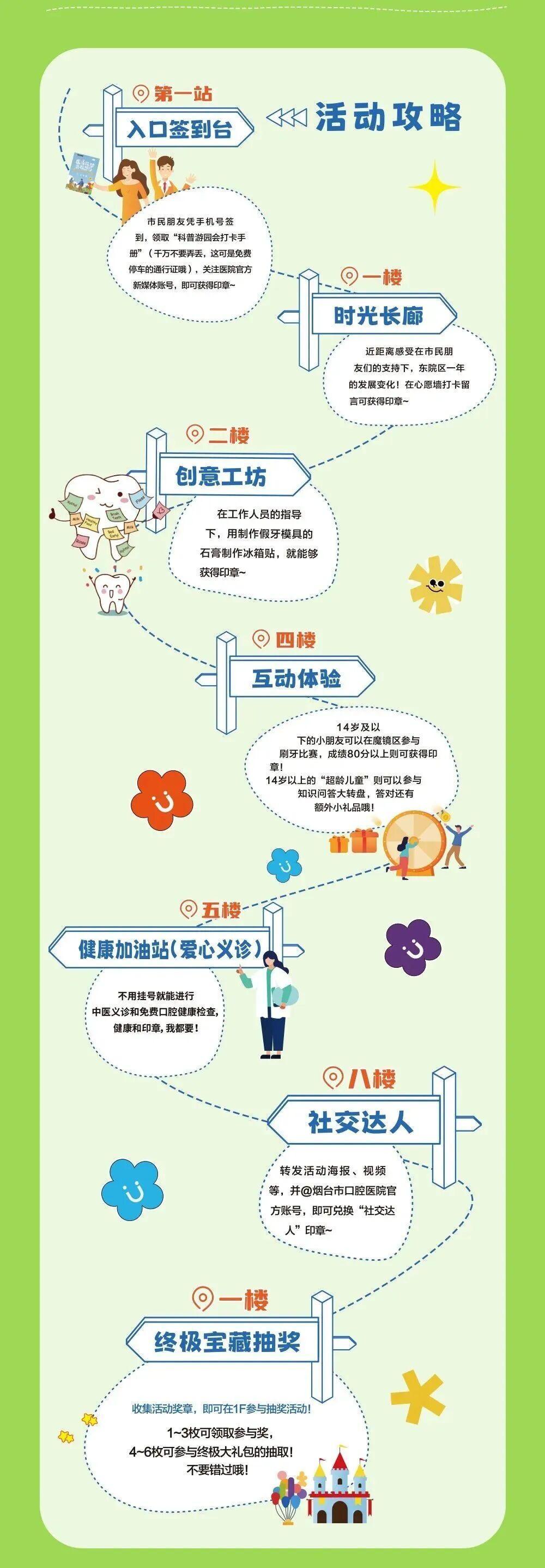 2.打卡集章:按照手册指引,前往1楼时光长廊、2楼DIY体验区、4楼刷牙答题游戏区、5楼老年朋友义诊区、8楼参与转发活动等地点打卡集章。