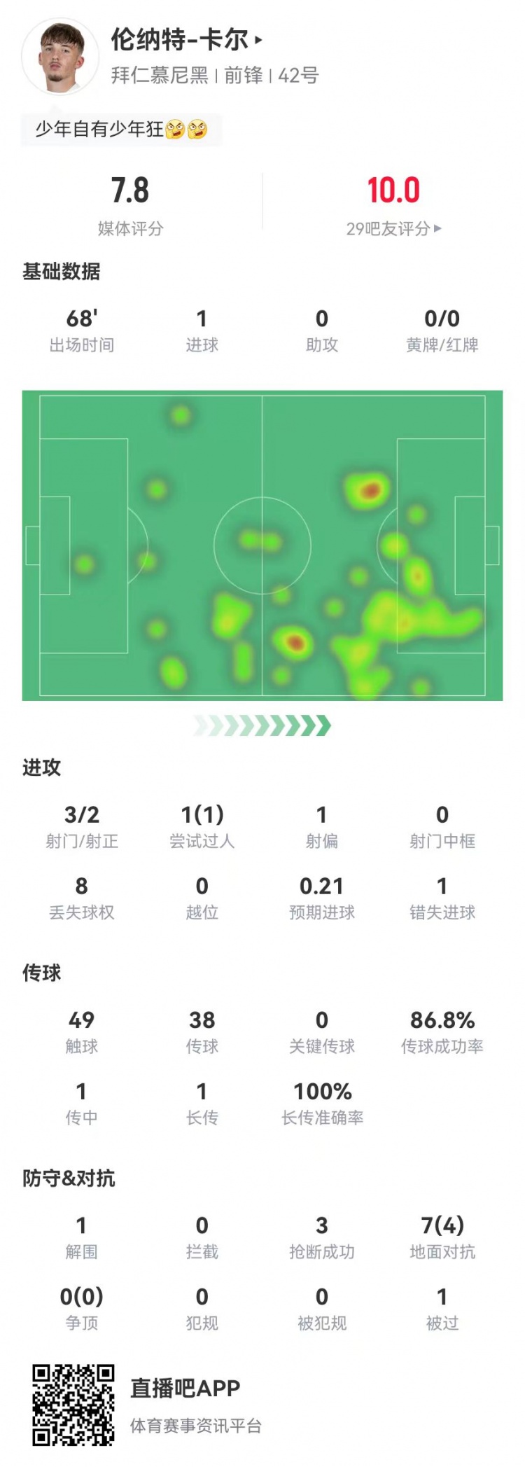 直播吧10月23日讯拜仁在本轮欧冠3-0领先布鲁日,小将伦纳特-卡尔本场数据如下: