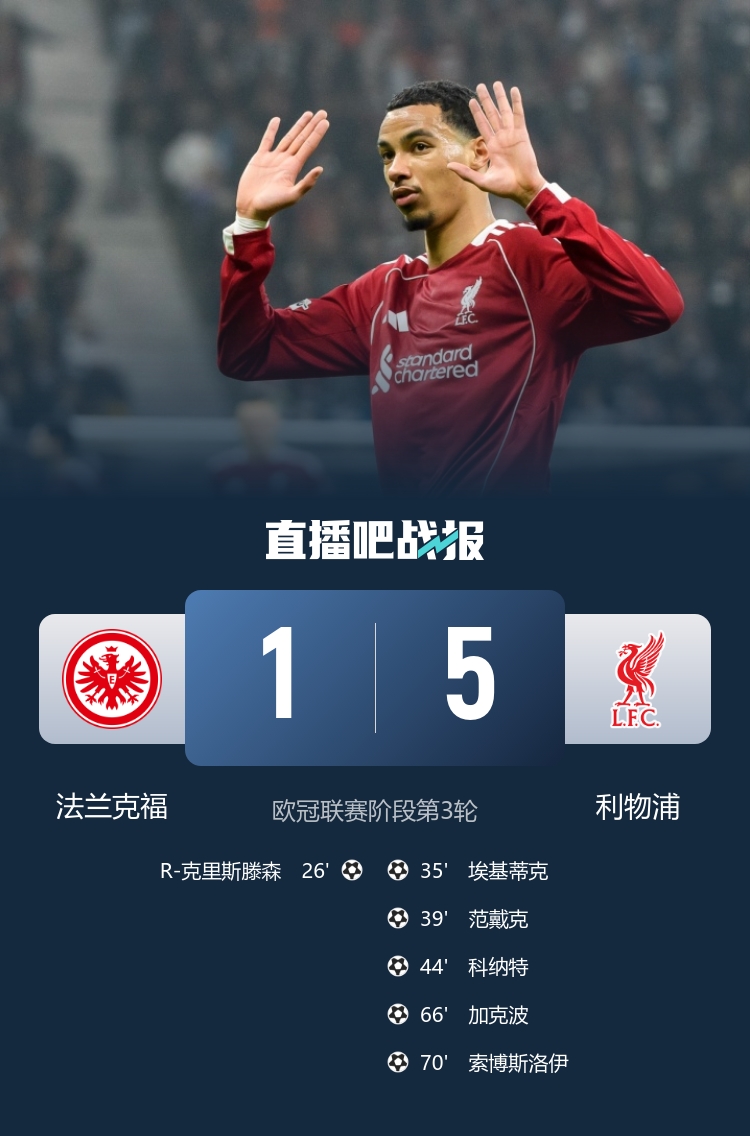 直播吧10月23日讯在本轮欧冠,利物浦5-1大胜法兰克福。
