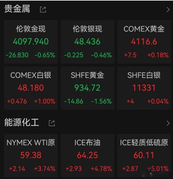 [#原油价格跳涨##现货黄金继续跳水#]美东时间10月22日(周三),大宗商品方面,国际金价走势分化,原油价格跳涨。贵金属方面,截至收盘,伦敦现货黄金价格跌0.65%,报4097.94美元/盎司,伦敦现货白银价格跌0.46%;COMEX黄金期货涨0.18%,报4116.6美元/盎司,COMEX白银期货涨1%。国际原油期货价格全线上涨。截至收盘,美国WTI原油期货涨超3%,布伦特原油期货涨超4%。(综合中国证券报)