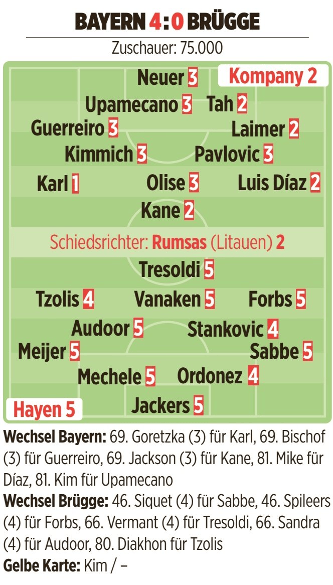 拜仁慕尼黑首发球员评分:诺伊尔(3分)、格雷罗(3分)、乌帕梅卡诺(3分)、塔(2分)、莱默尔(2分)、基米希(3分)、帕夫洛维奇(3分)、卡尔(1分)、奥利塞(3分)、迪亚斯(2分)、凯恩(2分)