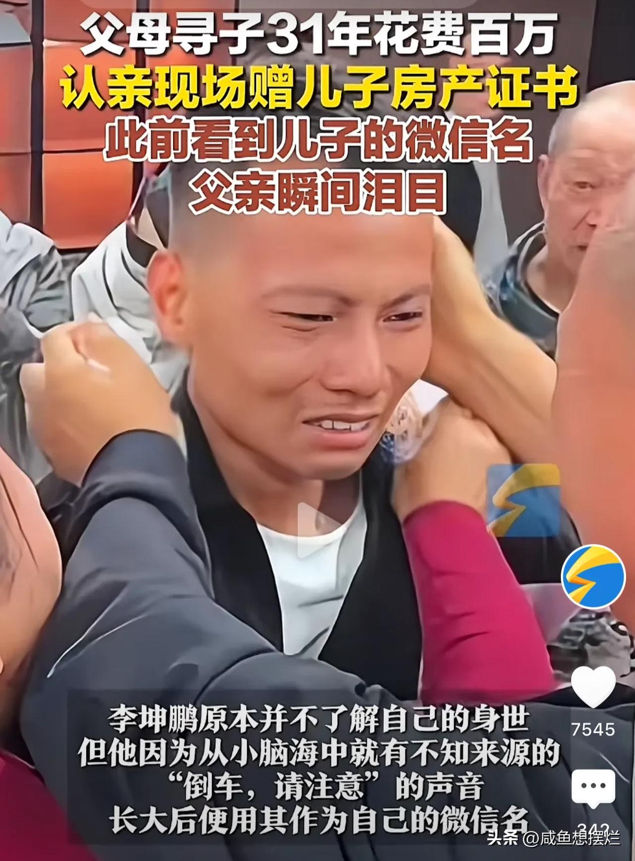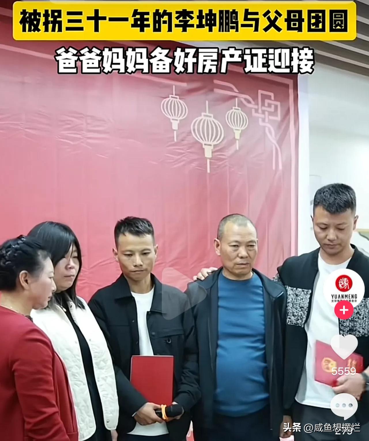 双向奔赴!四川父母苦苦寻子31年,找到儿子后拿房产证和金项链现场认亲。 31年前,4岁男孩李坤鹏在火车站走失,令原本幸福的一家陷入绝望。 29岁的妈妈从此踏上了寻子路,夫妻两人边创业边寻子,跑遍了祖国的大江南北,花费上百万从未放弃。 也许是老天被夫妻俩的真诚打动了,前些日子,在警察叔叔的帮助下,被拐31年的李坤鹏找到了。 当父亲添加他的微信时,看到微信名瞬间泪目。 “倒车,请注意”是李坤鹏脑海中挥之不去的声音,由于当时年幼,他并不记得为何对这个声音念念不忘,长大后便把他用作网名。 谜团最终被父亲给解开,原来李坤鹏小时候经常在爸爸的工地玩耍,大货车倒车时便会发出这个声音,久而久之,便成为了李坤鹏记忆最深的一句话。 认亲仪式上,李家父母拿出一本房产证交给儿子,李妈妈还给儿媳准备了金首饰,哥哥则给弟弟和弟媳送了新手机,仿佛恨不得把家里的好东西都拿出来。 李坤鹏抱着爸爸妈妈痛哭不已,在这一刻他也是有人爱的宝贝了,他长得瘦瘦小小的,比哥哥足足矮了半头,看外貌似乎吃了很多苦,好在如今苦尽甘来。 对于这个失而复得的孩子,李妈妈表示会弥补全力弥补31年来缺失的爱。 这也算是不幸中的万幸,一家人终于团聚了,爸爸妈妈心中的大石头也落地了,希望所有被拐儿童都能回家!
