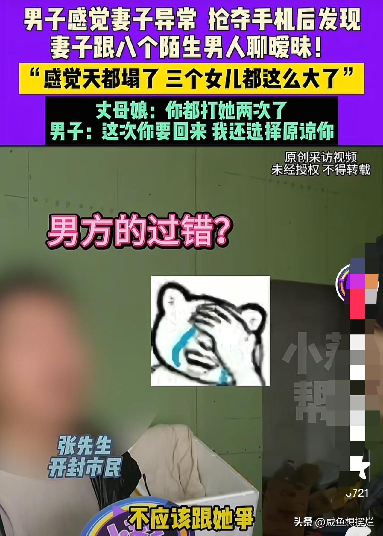 太炸裂!河南开封三个孩子的妈妈同时与八名男士交往,被老公抓到后毫无悔意,反而提了离婚离家出走了。 令人哭笑不得的是,即便女子做的这么过分了,她的老公还求助媒体,哭求老婆回心转意,只要她肯回来,以前的事既往不咎。 甚至他还道歉,后悔抢老婆的手机查看。 难道全天下没有女人了,又或者那个女人是仙女? 看看她与其他男人的聊天记录,卿卿我我,大谈两性秘事,不仅如此,他们还从网络奔现,约会了。 他的老公既羡慕又生气,老婆从来没跟自己说过这些甜言蜜语,谈一个就算了,还谈八个,这样搞得自己多没面子。 这些话,连记者都有些无语,没办法,他一心求回老婆,记者只好陪他一起去了老丈人家。 岳母一问三不知,只要是关于女儿的统统不清楚,对了,倒是没问了跟记者控诉,女婿已经打了女儿两回了。 男子挺实在的,立马承认了,打人还是因为妻子出轨的事,一时没忍住,他也意识到了自己的错误。 最后,男子声音哽咽:三个女儿不能没有妈妈,回来吧! 太悲哀了,真替这个男人不值,自己累死累活的干活挣钱,老婆不但不领情反倒给戴了这么多绿帽子,还有什么可留恋的,能不能硬气一回,让她有多远走多远!