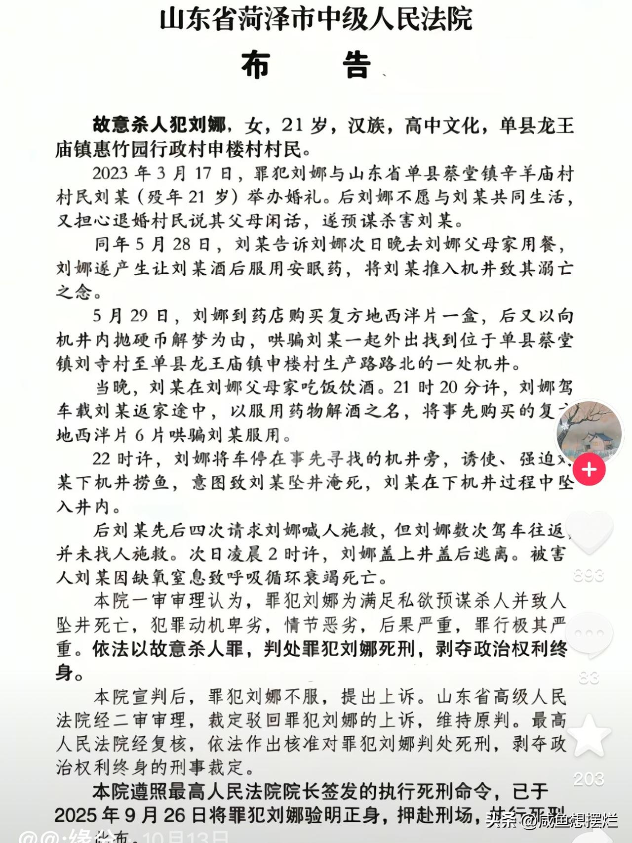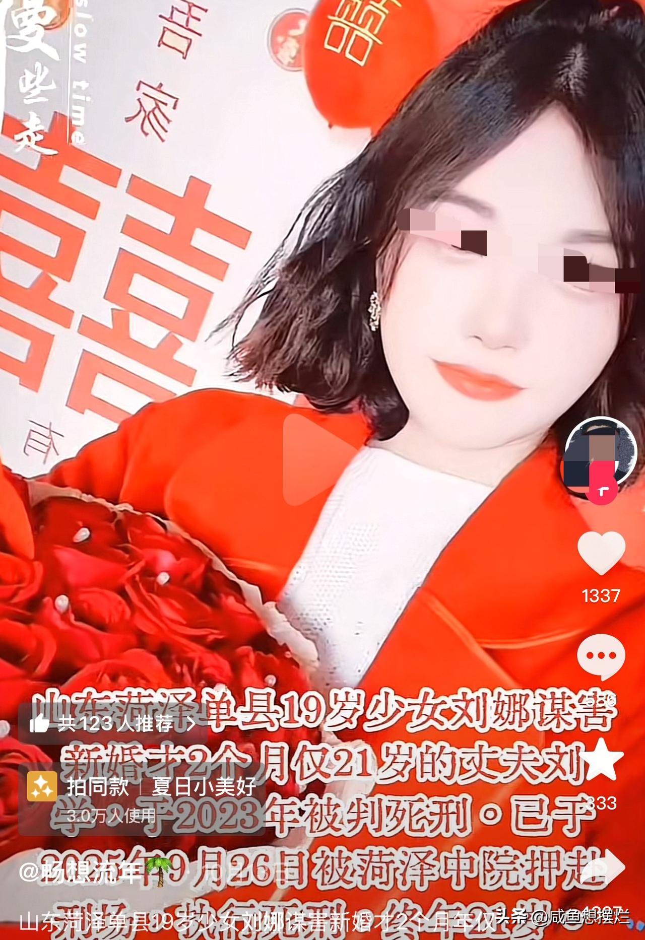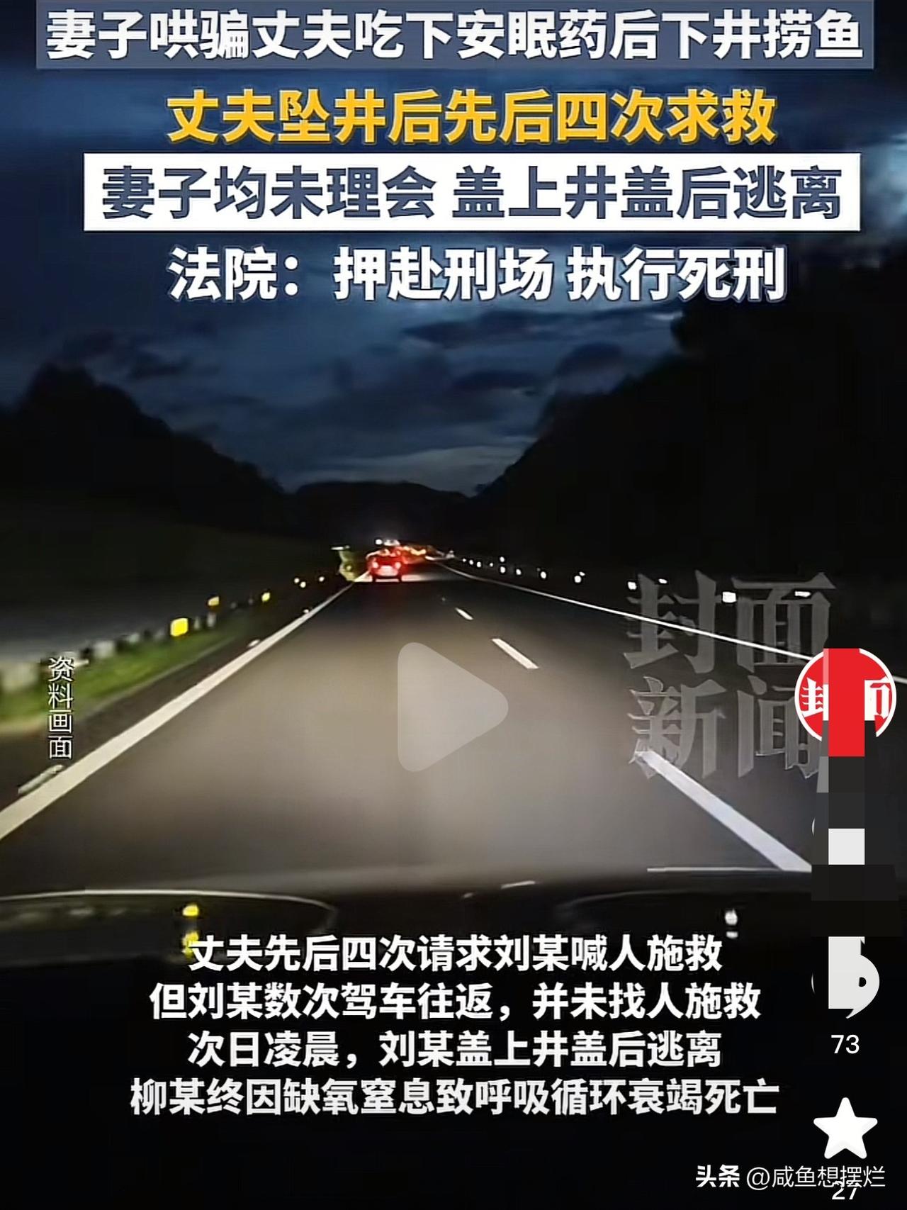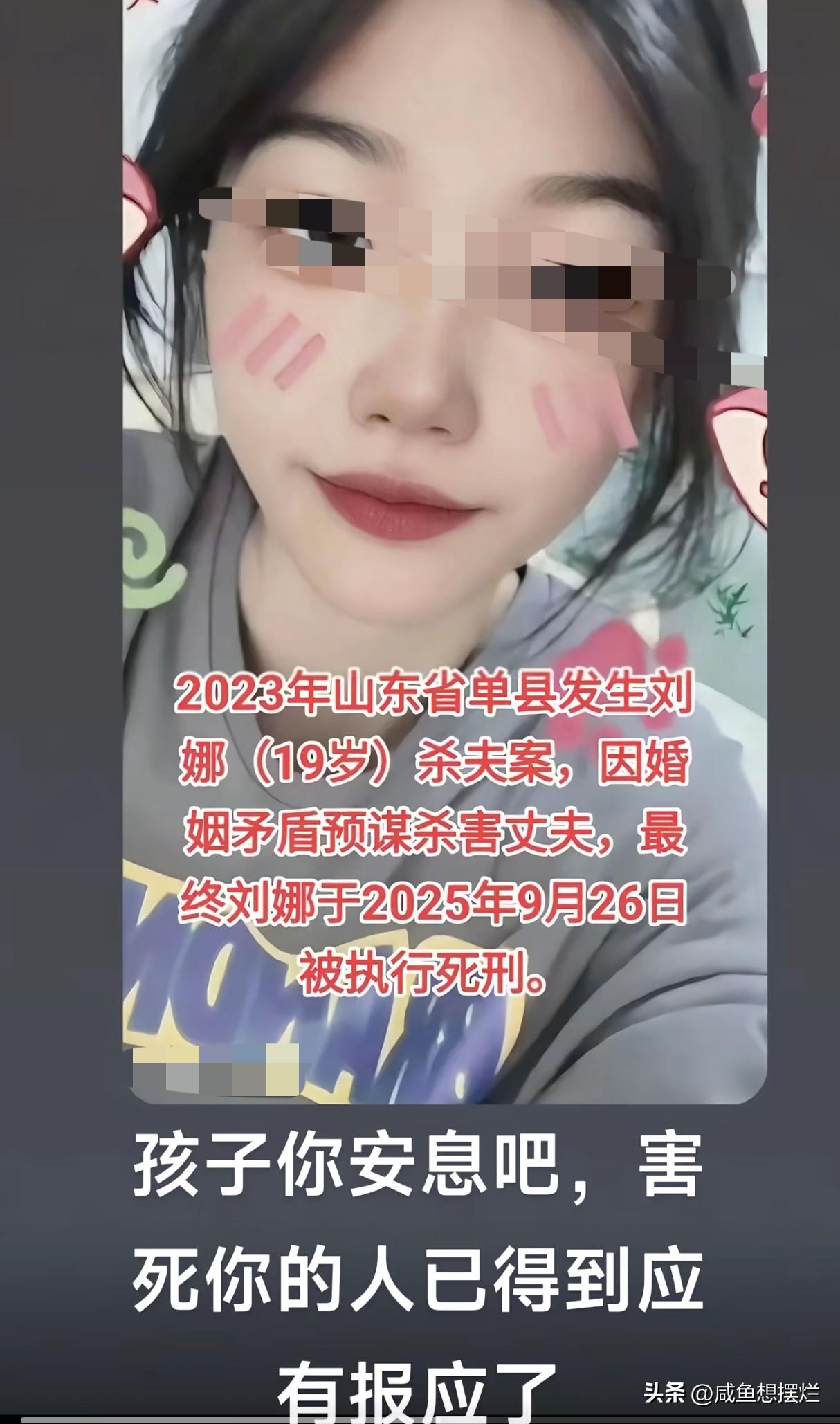刘娜谋害自己的丈夫时,才19岁,其实两人的婚姻并不受法律保护,因为他们没领结婚证。 两人在2013年3月份举行了婚礼,婚礼过后两个月,刘娜就不想与男方继续生活了,换做正常人,如果不想将就的话完全可以分开,彩礼该退的退,可刘娜怕退婚了父母被别人指指点点。 于是她就开启了魔鬼计划,以解酒为由哄骗21岁的老公吃下安眠药,又以机井抛硬币解梦为由,哄骗强迫老公下井抓鱼。 她的老公竟然相信了这么荒唐的理由,又或许是特别爱她,竟然真的下井了。 坠井后,男方四次呼救,刘娜置之不理,她一心想让老公消失,又怎么会救他呢? 凌晨两点钟,刘娜感觉差不多了,返回盖上井盖,伪造了老公意外坠井的假象,好在警方积极调查,戳穿了她的谎言。 如今,刘娜已被执行死刑,也算为自己的恶行付出代价了,只是可怜男方一家人,一场婚姻损失了钱财不说,还搭上了儿子的命,太唏嘘了。 所以,找对象一定要擦亮眼睛,感觉不合适好聚好散,别纠缠,人这一辈子,没有比好好活着更重要的了。