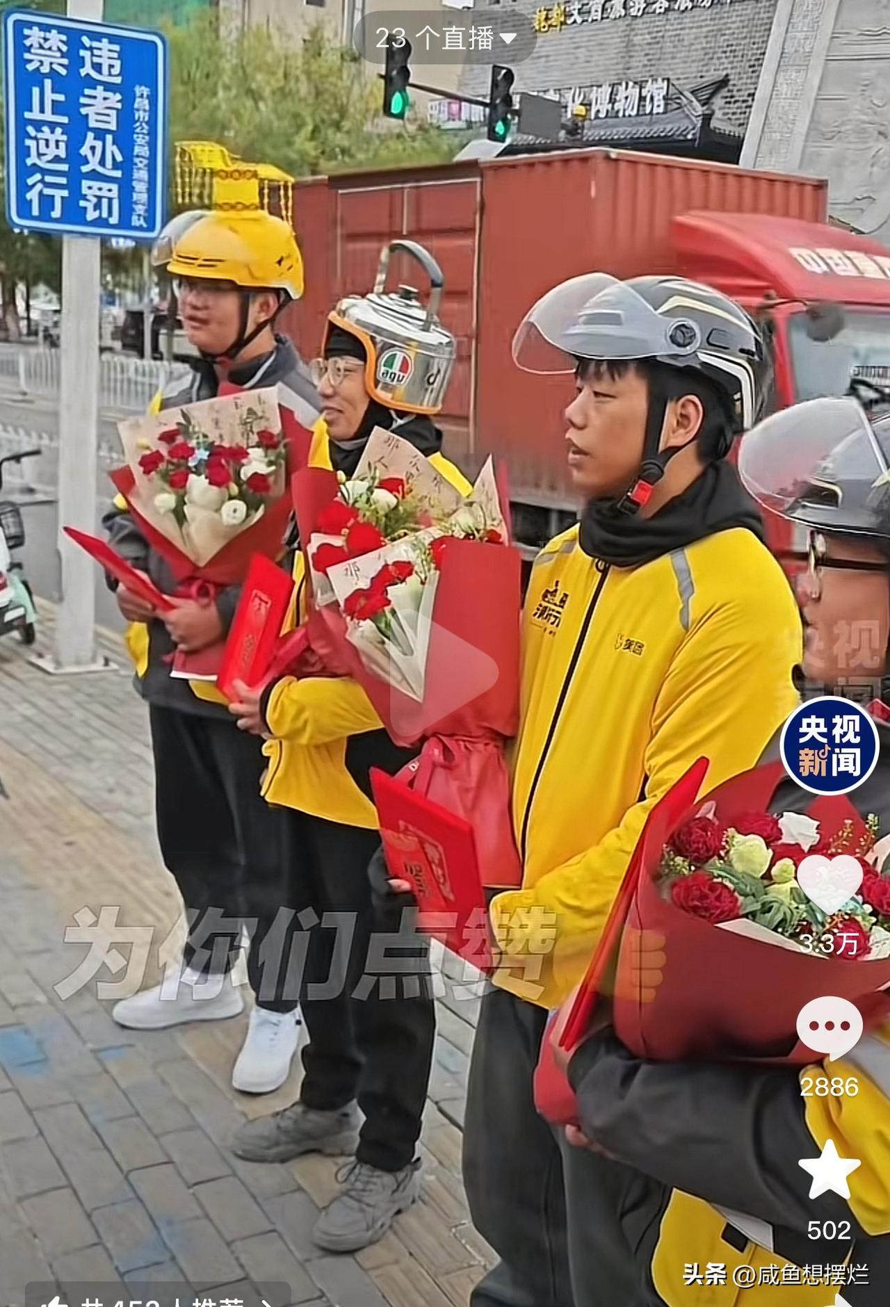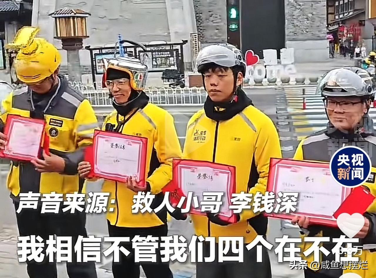 情侣深夜吵架要跳河,四名外卖小哥百米冲刺救人,网友却发现了有意思的一幕:我一眼就知道谁叫壶了! 近日,河南许昌,发生了件正能量的事,令网友纷纷点赞。 一天深夜,街上冷冷清清,几名外卖小哥在路边等单,这时候,一对情侣的争吵声显得格外尖锐。 几个人在旁边默默的看着,却发现了异常,男生情绪崩溃,正在往河对面跑,想要跳河。 外卖小哥抓紧呼叫同伴:那个男的不对劲,壶。 他们边跑边喊:你弄啥嘞,你弄啥呀,试图分散男生的注意力。 庆幸的是,他们及时赶到,抓住了男生的胳膊,成功把他拽了回来,当时情况紧急,他们百米冲刺,要是再晚一秒,男生就跳下去了。 这边他们刚安抚完男生,那边女生情绪又崩溃了,直接躺到马路中间,外卖小哥只好给她拦着车,没想到,女生爬起来就往桥边上跑,她也要跳河,还好外卖小哥反应灵敏,一把拽了回来。 不知道两人到底发生了什么事才想不开,有什么比好好活着还重要的,如果没有外卖小哥,恐怕就要发生悲剧了。 事后,小哥说,换作其他人,遇见这种事也会出手相救的。 好人有好报,他们获得了荣誉证书和奖励,拍照时,网友却发现了有意思的一幕,一个小哥带着烧水壶头盔,另一个戴着皇帝头盔。 看到这里,大家笑了,有网友调侃:玉皇大帝都亲自来送外卖了。 说归说笑归笑,外卖小哥们的举动值得赞扬,还有那对情侣,最好锁死,千万别分手!