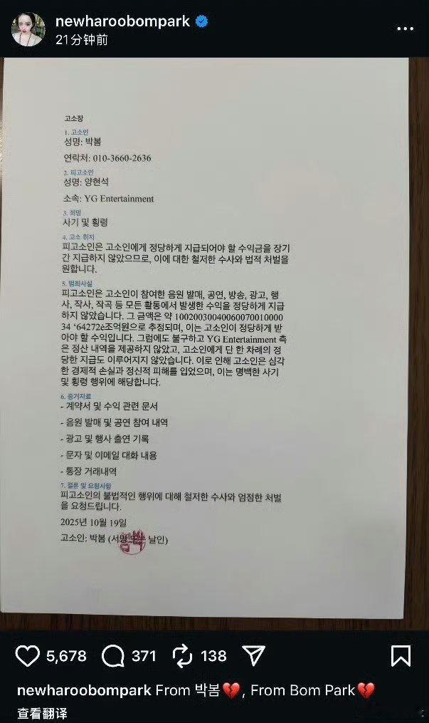 朴春中断所有活动 朴春起诉杨贤硕后续来了,朴春所属社发表声明,朴春与和2N