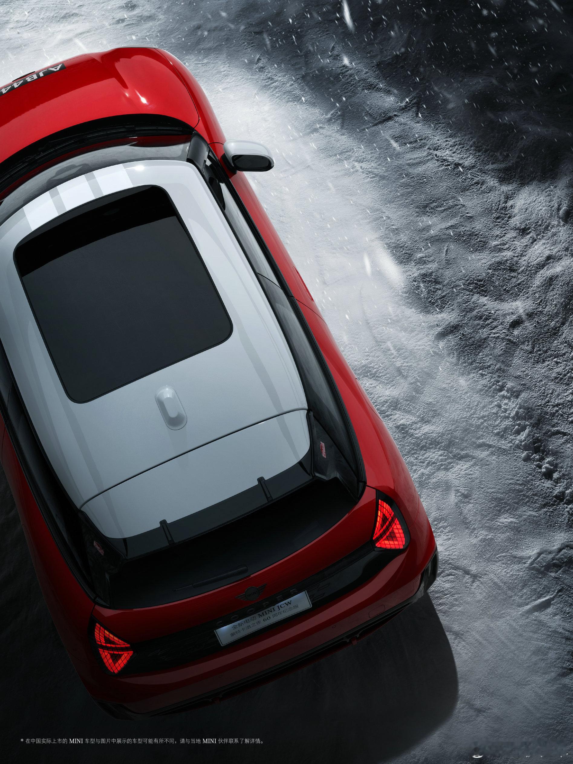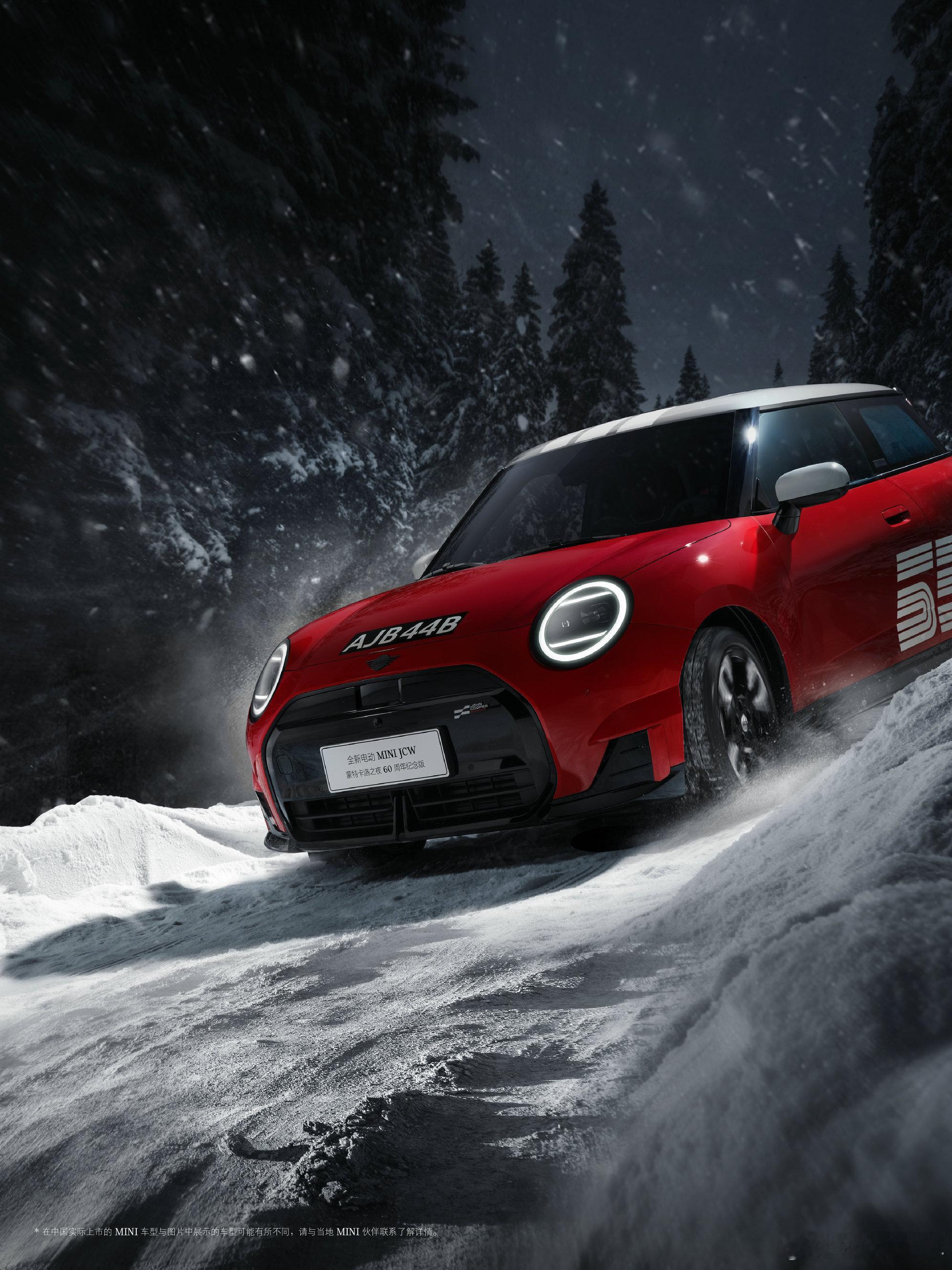 新标志性辣椒红车身+首次应用于电动JCW车型的蒙特卡洛雪夜限定白顶,还原冠军配色,车顶印有独特的雪地轨迹压纹。雪色轮毂与红色制动卡钳形成鲜明对比,视觉上兼具复古拉力风格与现代运动气质。