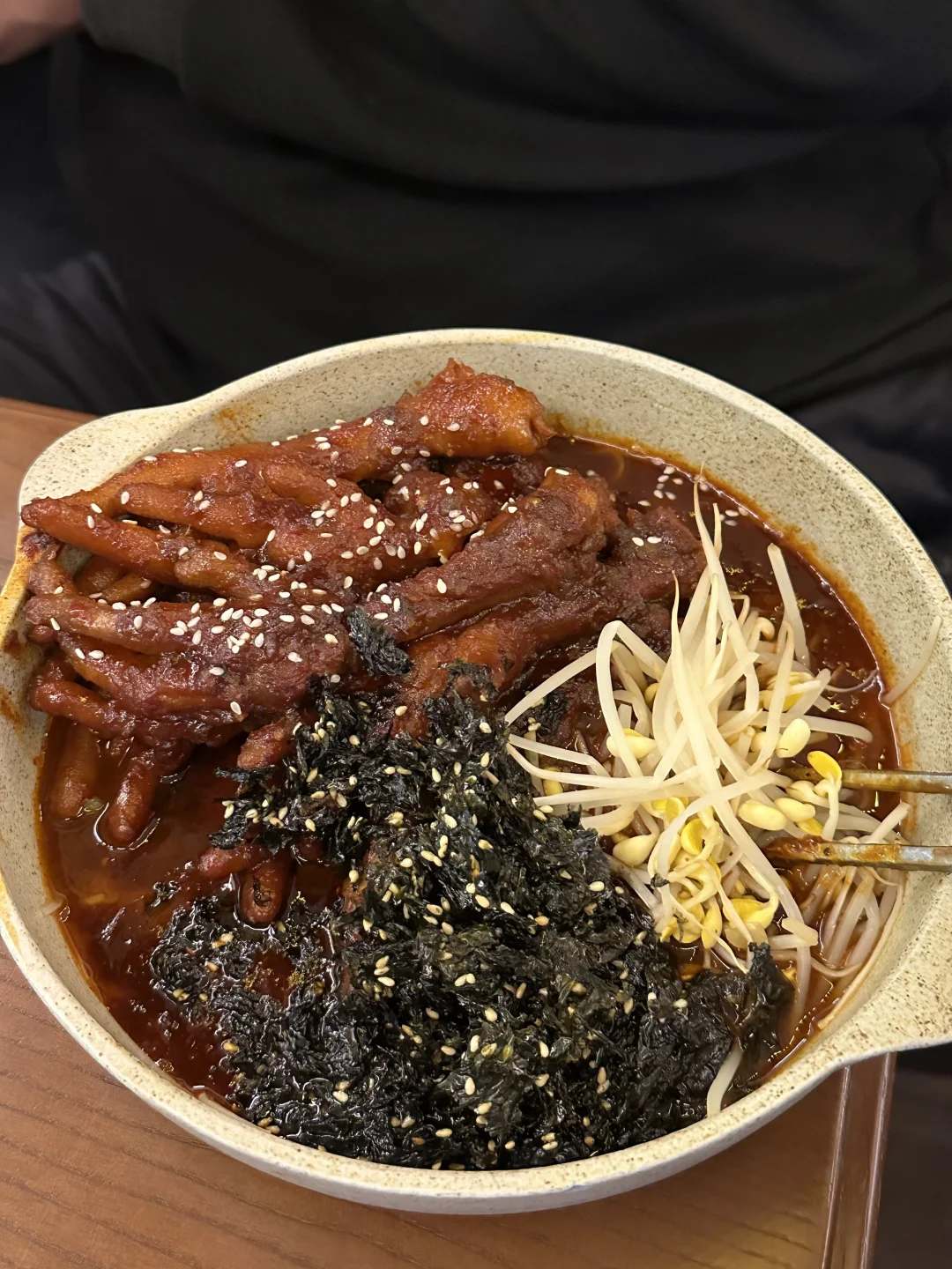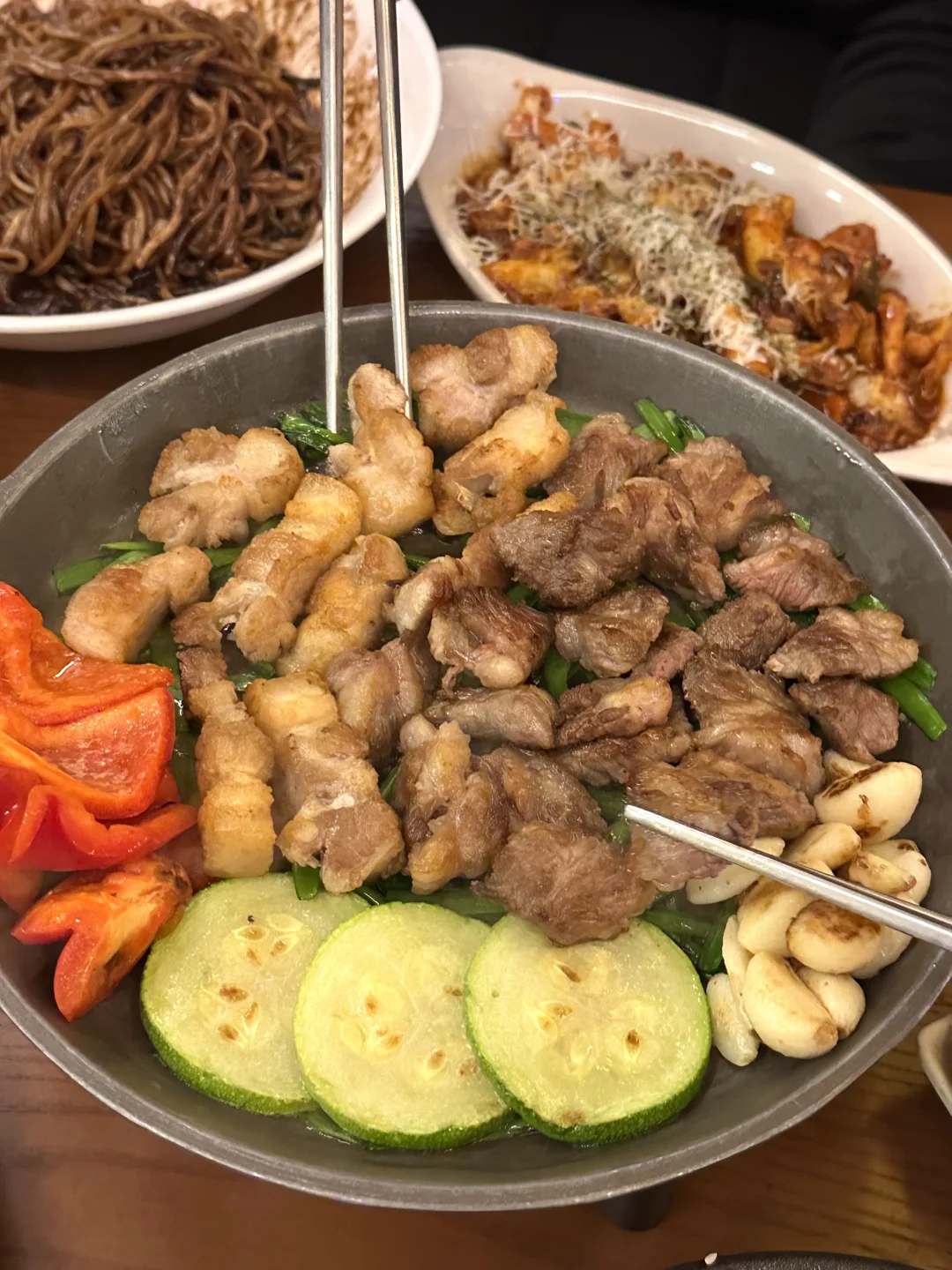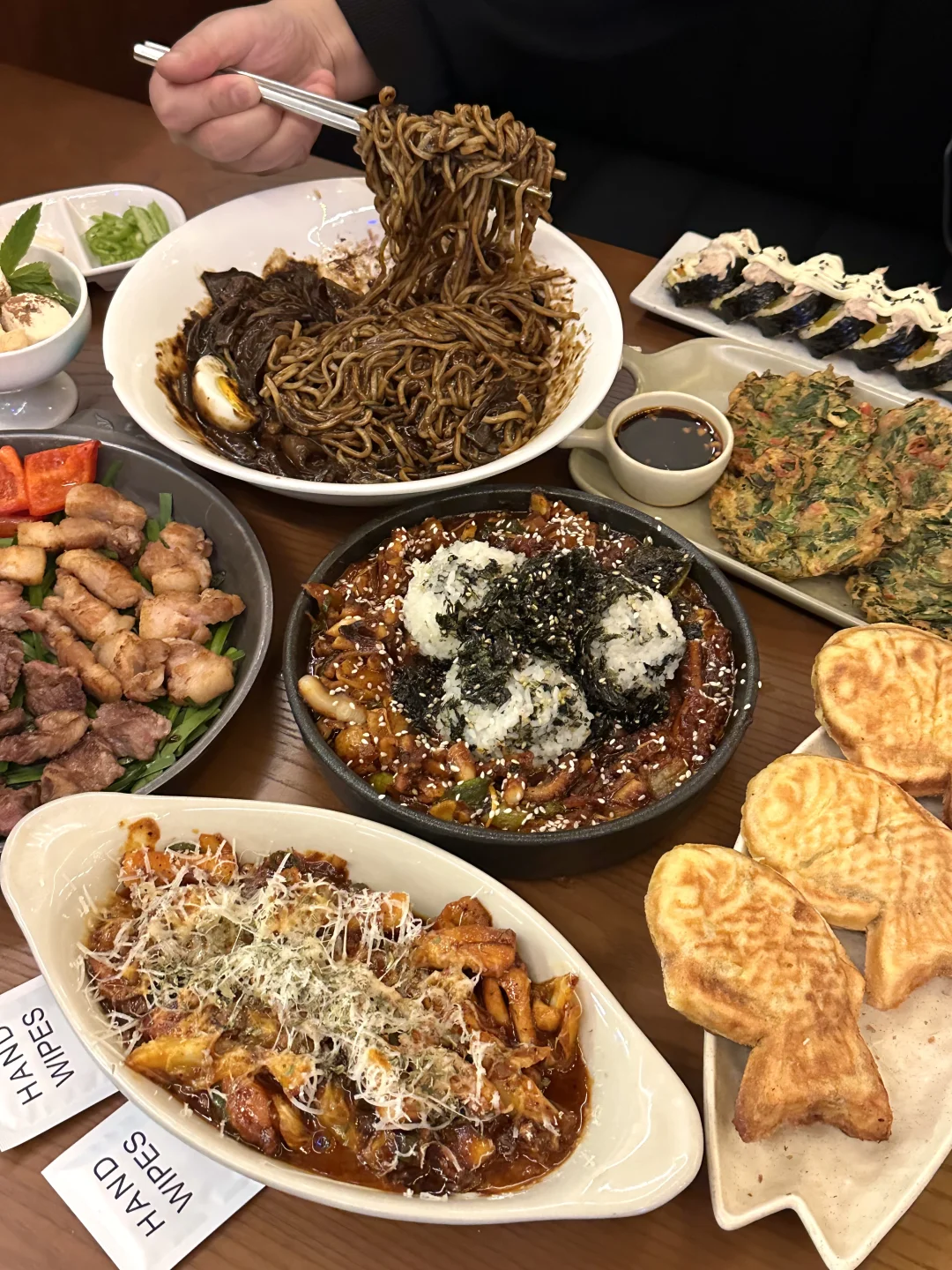 金陵中环,已经吃了十几次了 每次馋韩料都会来他家! 牛肋条+五花肉 韭菜鸡蛋饼(个人觉得比泡菜饼还要好吃 辣炒鸡 炸酱面 辣鸡爪 鲫鱼都经常吃