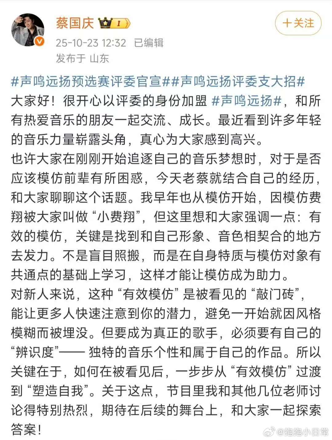 蔡国庆谈如何看待音乐新人模仿声鸣远扬 “有效模仿”是蔡国庆老师给音乐新人最宝贵的建议,这不仅是学习的过程,更是展示自己独特魅力的一种方式。
