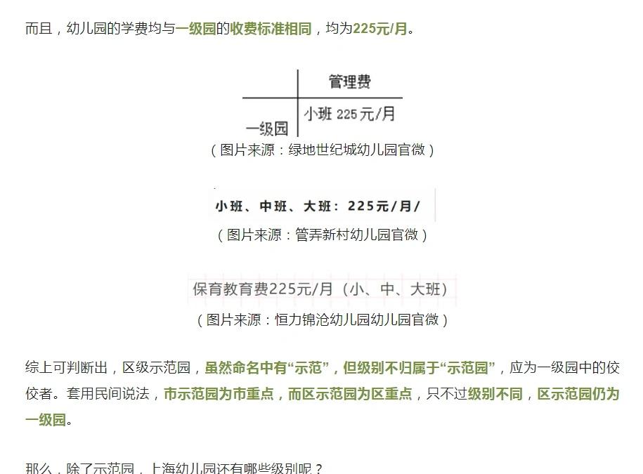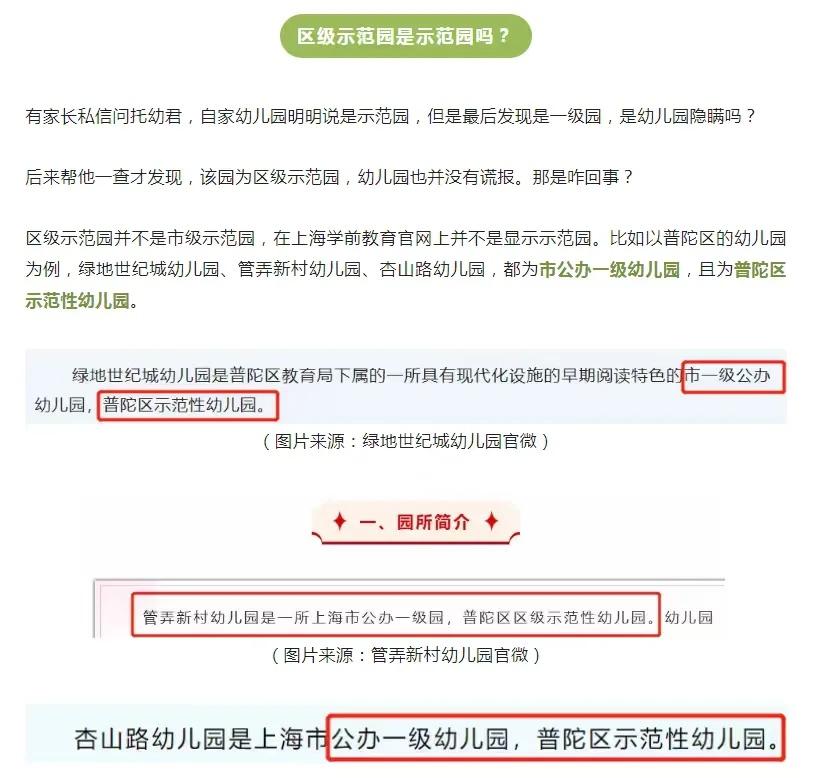 叫示范园却不是示范园,这是咋回事? [皱眉][皱眉]有家长私信问托幼君,自家幼儿园明明说是示范园,但是最后发现是一级园,是幼儿园隐瞒吗? [汗][汗]后来帮他一查才发现,该园为区级示范园,幼儿园也并没有谎报。那是咋回事? [偷笑][偷笑]区级示范园并不是市级示范园,在上海学前教育官网上并不是显示示范园。比如以普陀区的幼儿园为例,绿地世纪城幼儿园、管弄新村幼儿园、杏山路幼儿园,都为市公办一级幼儿园,且为普陀区示范性幼儿园。 [偷笑][偷笑]而且,幼儿园的学费均与一级园的收费标准相同,均为225元/月。 [偷笑][偷笑]综上可判断出,区级示范园,虽然命名中有“示范”,但级别不归属于“示范园”,应为一级园中的佼佼者。套用民间说法,市示范园为市重点,而区示范园为区重点,只不过级别不同,区示范园仍为一级园。 上海幼儿园 幼儿园 上海入园