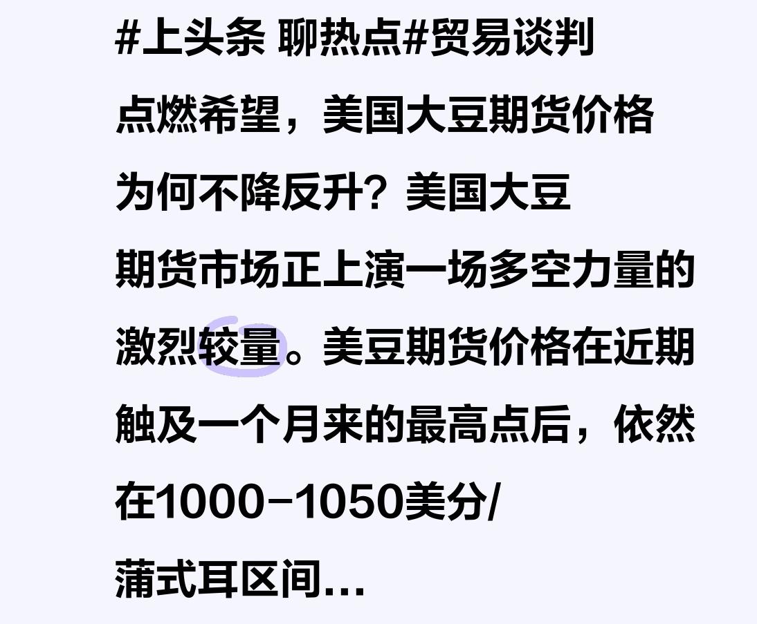 贸易谈判点燃希望,美国大豆期货价格为何不降反升? 美国大豆期货市场正上演一场多空力量的激烈较量。 美豆期货价格在近期触及一个月来的最高点后,依然在1000-1050美分/蒲式耳区间波动。 这令许多人感到困惑——一方面,中国对美国大豆的月进口量自2018年11月以来首次降为零,另一方面美国大豆本年度的出口检验总量比去年同期下降了31%。 但在看似不利的环境下,市场对中美贸易谈判的乐观情绪与美国国内强劲的压榨需求,却共同为大豆价格构筑了坚实的底部支撑。 01 贸易乐观情绪 市场对中美贸易谈判的乐观预期,成为推动美豆价格上涨的首要动力。 美国总统特朗普近期表示,他相信双方能够达成大豆协议,并希望中国购买“至少与之前数量相同的”大豆。 这一表态重燃了市场信心,促使投机基金停止打压大豆期货。 交易数据显示,大宗商品基金周一净买入美国大豆期货合约5000手,直接推动了价格反弹。 市场参与者倾向于相信全球贸易局势可能带来积极结果,这正是价格上涨的心理基础。 02 国内需求强劲 在美国大豆出口受阻的同时,其国内压榨需求却意外保持强劲,为价格提供了重要支撑。 美国全国油籽加工商协会数据显示,9月份美国大豆压榨量达到1.978亿蒲式耳,处于历史第四高位。 这一数据环比增加4.24%,同比大幅增加11.59%。 压榨需求增长部分源于生物燃料行业的旺盛需求。美国环境保护署计划将2026年生物柴油掺混义务量提高至56.1亿加仑。 同时,9月份生物柴油可识别码较8月大幅增长,表明可再生柴油产量处于扩张阶段,进一步刺激了大豆压榨需求。 03 南美竞争与政府停摆 南美大豆的激烈竞争与美国政府停摆,构成了市场的双重压力。 巴西大豆出口正强势领跑,10月上旬出口量达216.6万吨,日均出口量同比增加26.5%。 巴西全国谷物出口商协会已将10月巴西大豆出口预估上调至731万吨,同比大幅增加65%。 与此同时,美国政府的停摆导致市场数据缺失。美国农业部未能按期发布10月作物产量报告,使市场在评估供需平衡时出现盲点。 缺乏官方数据指引,加大了市场波动性,投资者只能依赖过时的数据和市场分析机构的预估。 放眼未来,美国大豆期货市场犹如一个等待双重引爆的炸药包——一头是中美贸易谈判的引线,另一头是南美天气变化的火花。 如果贸易谈判取得突破,中国重启美豆采购,价格可能迅速挑战10.5美元阻力位。 反之,巴西大豆创纪录的丰产预期将继续压制美豆价格的反弹空间,迫使价格再次考验10美元关口。