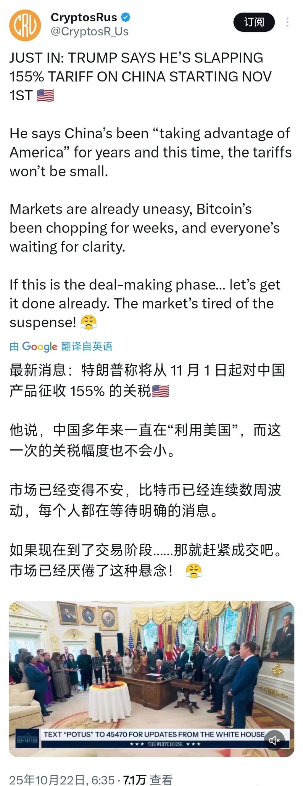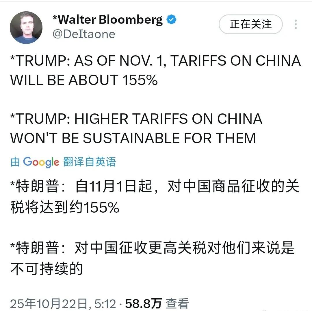 就在刚刚 特朗普公开表态:或在11月1日起对中国征收高达155%的关税,虽然这个关税是不可持续的,但中国多年来一直“利用美国”,所以这个关税比例不会小。 很明显,特朗普最近确实被中国反制的有些“泄气”,明知道对中国加征关税毫无意义,却总是反复提出来,如果没记错,今年4月份那波中美关税博弈,美国的通货膨胀上涨明显,有些中国商品直接上涨30%,平均每个美国家庭一年要多掏1300美元的支出,加州州长因为这个关税政策,甚至扬言要与美国搞分离,因为关税实行一星期,加州损失了4500美元的中美贸易订单,对加州经济造成了不小的损失。 美国前财长萨默斯也曾警告特朗普政府,当前关税政策可能导致200万人失业,每个家庭年收入损失超过5000美元,已经有很多美国家庭开始讨论“关税附加费”问题,因为每买一件进口商品,都会因为美政府的关税政策被反向加税,像中国的儿童座椅、哮喘呼吸机,只要里面有中国零件,价格都上涨了30%。 这些情况特朗普政府能不知道么?他们肯定知道,但这场博弈拼既然已经开始,中美都不可能轻易妥协的,虽然有时候也知道特朗普说的是“气话”,但他对中国的态度可一直没变,就是想打倒我们,所以我们一定要警惕任何意外的发生,尤其像荷兰这次“明抢”中国企业一样,博弈到一定程度,这些欧美国家肯定会耍无赖,如果我们没有反制的“底牌”,放心,几年时间,中国在外的企业肯定会被这些欧美无赖蚕食干净。