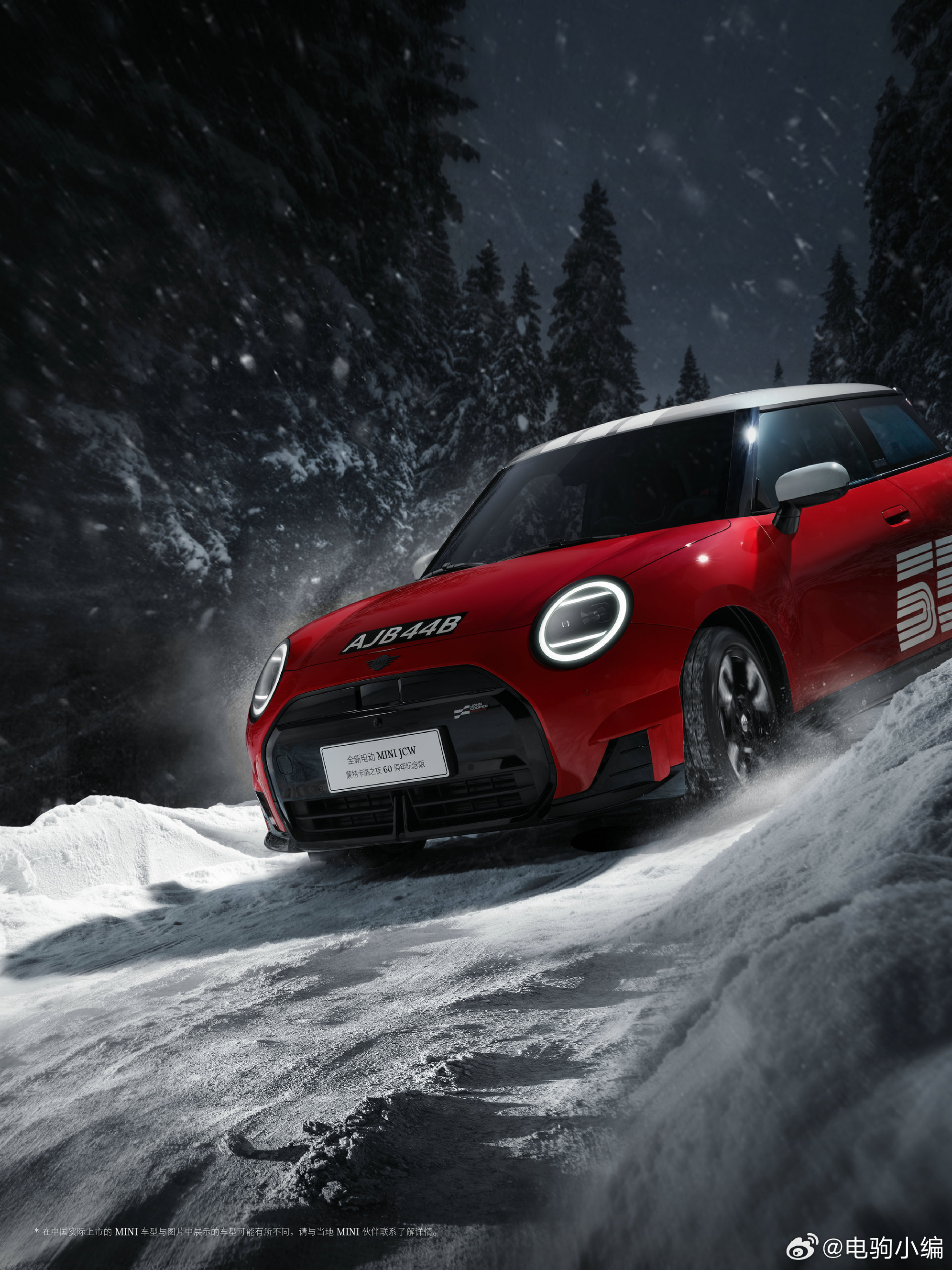 设计上满是致敬当年 52 号 Mini Cooper的细节:辣椒红车身 + 雪夜限定白顶,还原经典冠军色;车顶有雪地轨迹压纹,雪色轮毂配红色卡钳,兼顾复古与运动。
