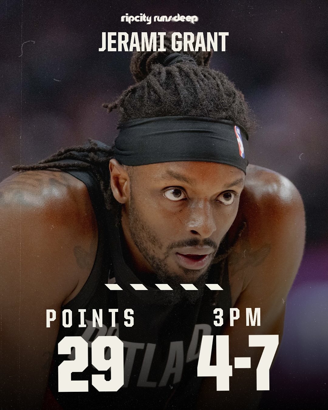 本场比赛,杰拉米-格兰特出场28分钟,得到29分3篮板1助攻1盖帽,投篮14中10,三分7中4。