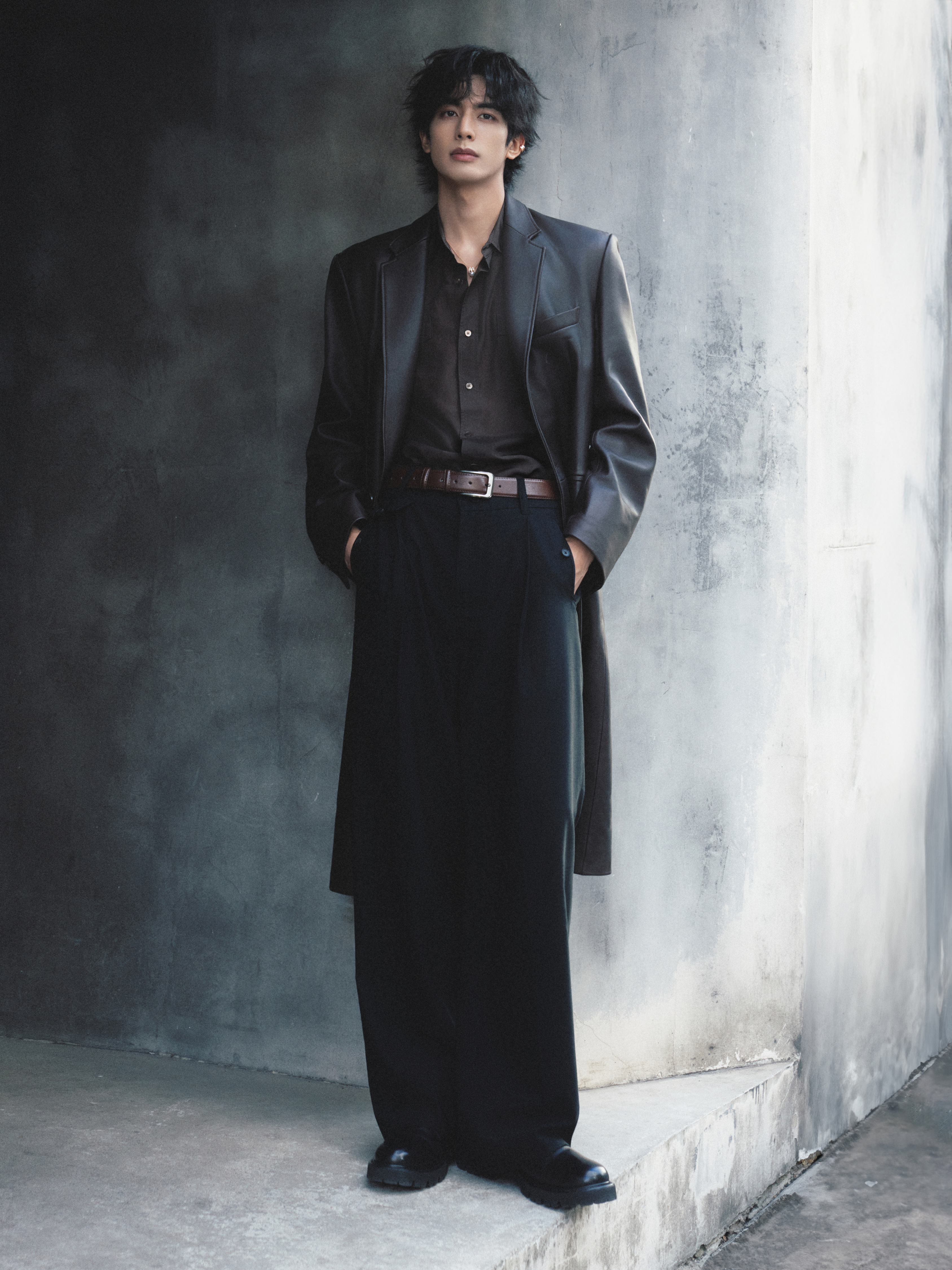 先是直播亮相的Valentino棕色皮质大衣,意式复古硬朗碰撞东方骨相的含蓄,微卷短发配珍珠项链与腕表,把"松弛贵气"诠释得淋漓尽致。行走间衣袂翻飞,活脱脱从电影里走出的复古男神。